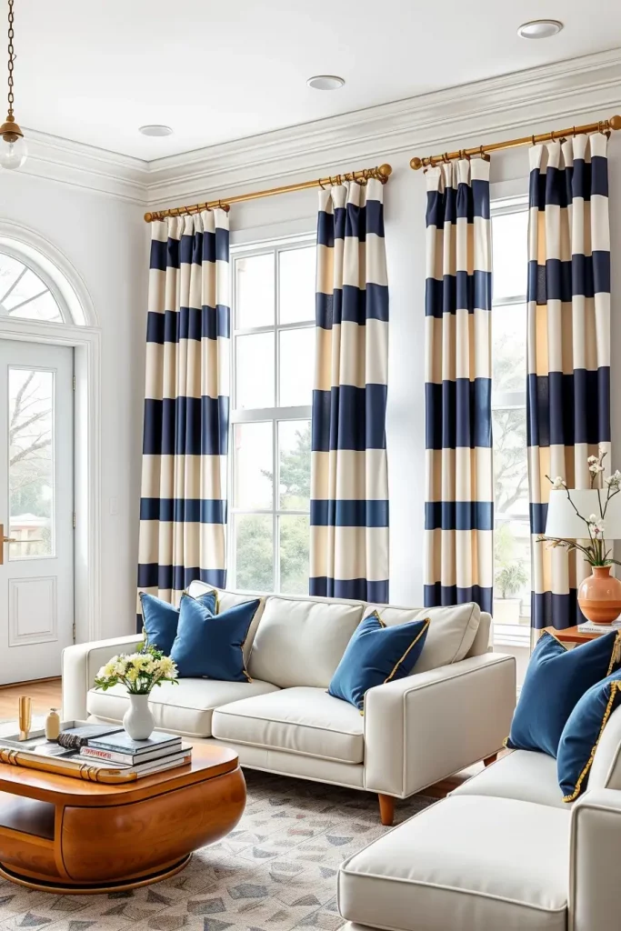 Curtains are often overlooked, but in a navy and white living room, striped curtains can be a subtle yet impactful design element. Visual structure originates from curtains in my design approach since they establish vertical balance and rhythmic patterns in spaces.