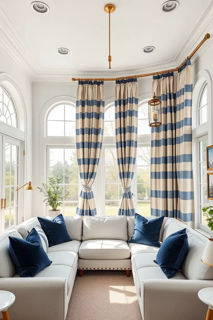 The absolute best way to combine white walls with navy and white striped curtains is my favorite choice for this design. The wide stripes I select produce a strong graphic visual effect. Curtain frames allow the eyes to follow an upward direction that makes ceilings seem taller. I begin with brass or matte black curtain rods followed by sheer inner layers that provide a gentle touch to incoming light.
