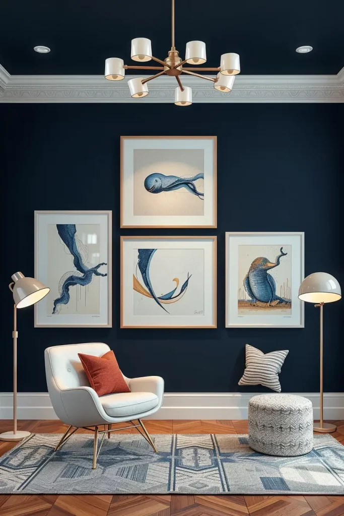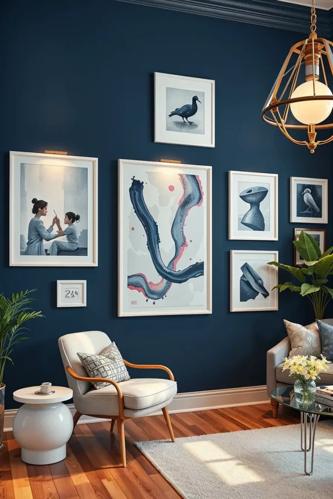I begin my design by painting the wall with navy which establishes both artistic and moody characteristics. White and light-colored frames serve as my preferred choice because they enhance the visual appeal of the navy background. The suitable artwork for this color combination features abstract navy and white prints together with coastal photography and black-and-white family images. The organization of my artwork pieces into symmetrical and grid arrangements helps me achieve additional unity.