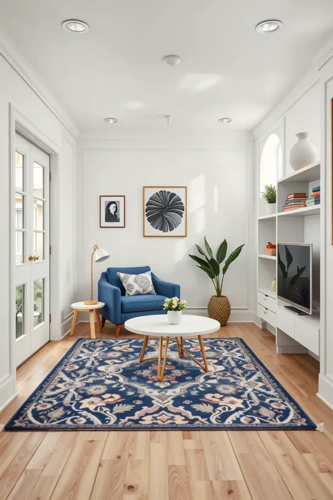 When dealing with small areas I choose navy exclusively for a single statement piece such as a chair or compact sofa then paint the walls white to enhance light reflection. This area appears spacious because the white coffee table pairs with a narrow rug displaying navy and white patterns and white-painted open shelves. Walls should be used as mounting points for lighting fixtures instead of floor lamps to save space and mirrors will distribute light through the room.