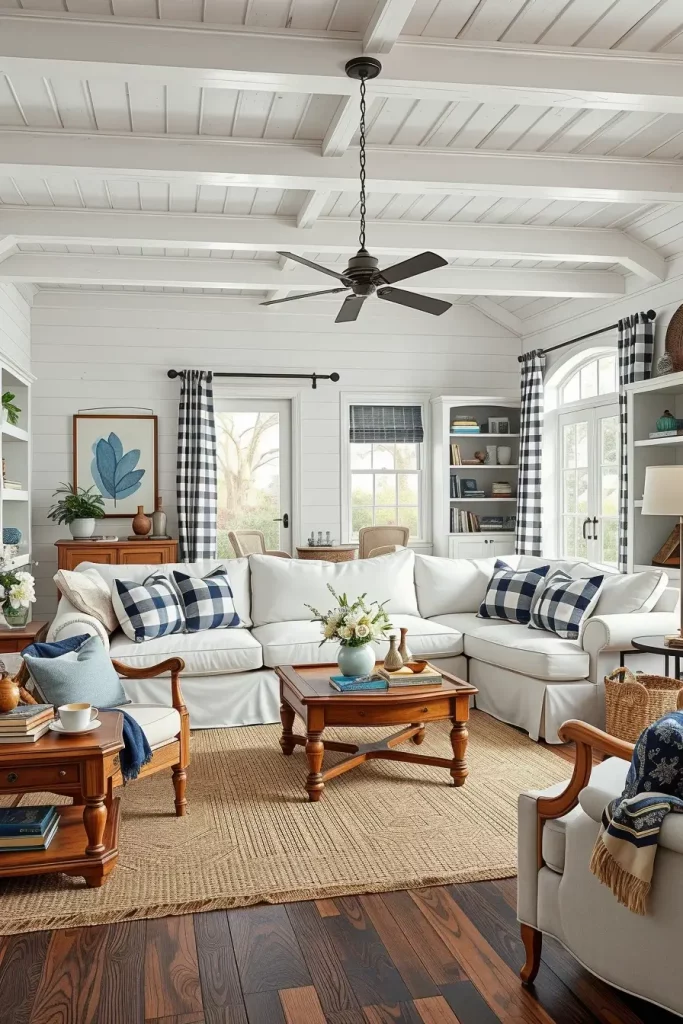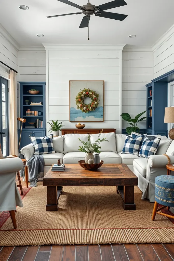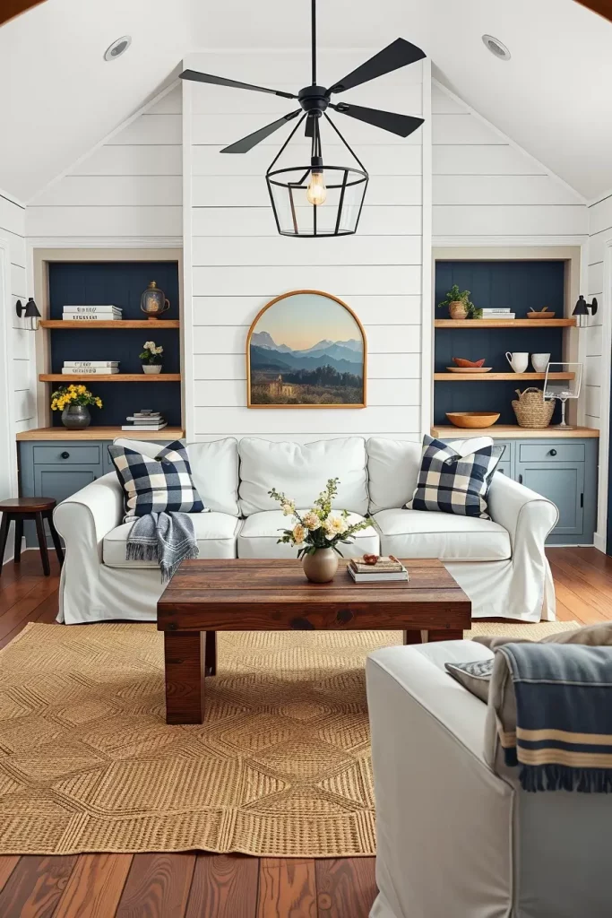 My design advice includes using white shiplap walls together with navy built-in shelves or painting a coffee table in navy. White couches will look amazing as they rest under rustic coffee tables constructed from reclaimed wood. Buffalo-check navy pillows finish the look through their addition to the scene. The farmhouse style finds its completion through a jute rug combined with black metal lighting fixtures that add industrial charm.