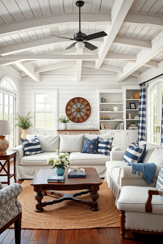 The design of a navy and white living room in a cozy cottage style enables me to unite traditional colors with comforting materials. The design process starts with a white slipcovered sofa which I position in front of shiplap walls painted navy blue or striped textiles to achieve cottage style. The combination of light hardwood floors with whitewashed ceiling beams creates a relaxing atmosphere that brings charm to the room.