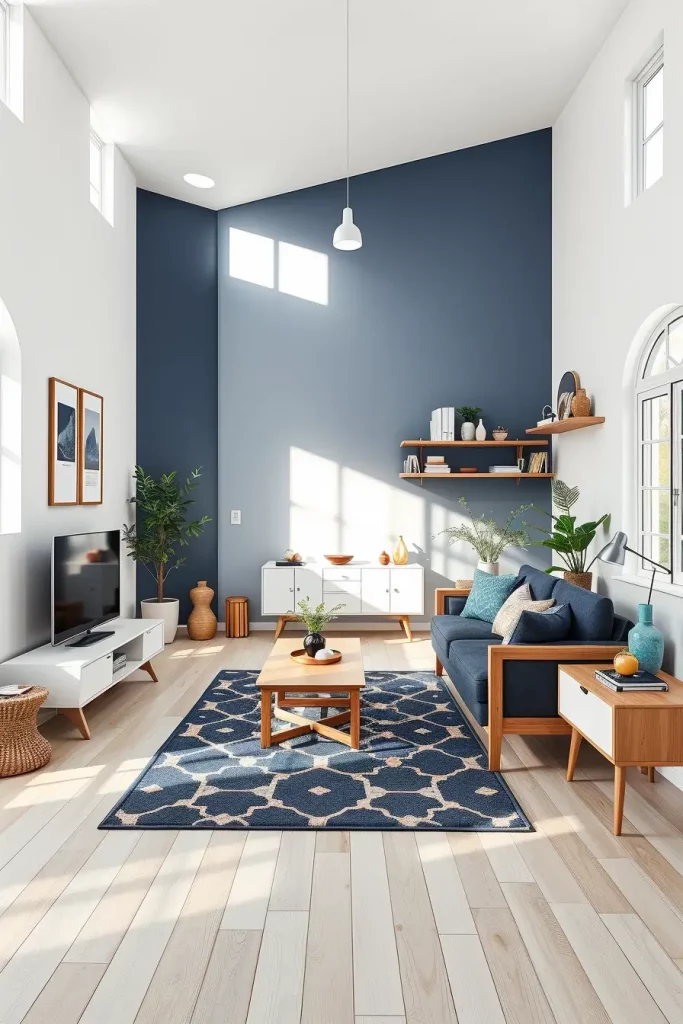 Colorful living spaces appeal to me the most when they show functional beauty through minimalist white and natural wood pieces which include media consoles and floating shelves. The navy color appears in my designs through geometric-patterned rugs and upholstered ottomans and soft throw blankets. The space becomes brighter through the combination of natural light and glass decorative elements.