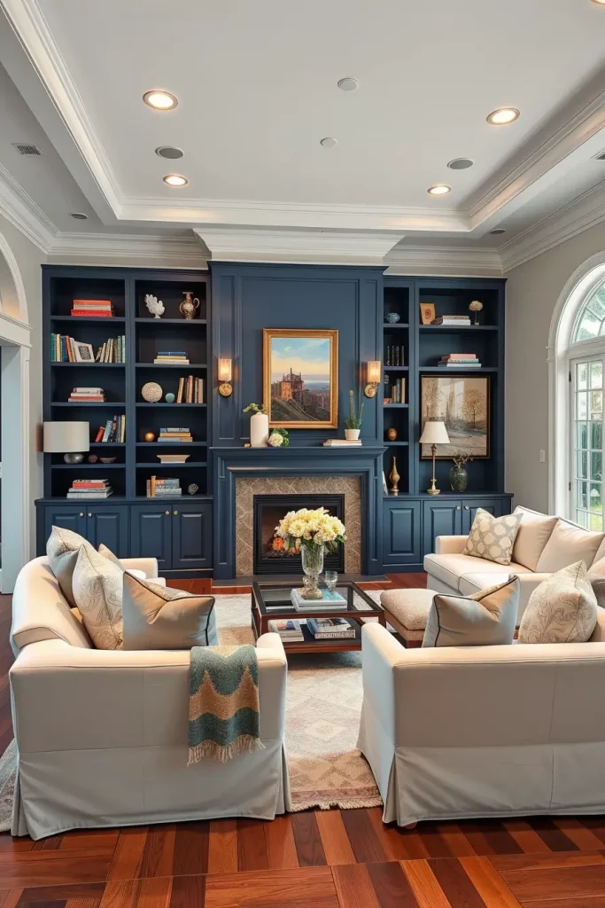 Custom built-in shelves in navy blue with white trim stand as my top pick to generate both style and utility in navy and white living spaces. The furniture usually surrounds fireplaces and entertainment spaces to perform dual roles as decorative showcases and functional storage units. The white trim elements enhance the navy background through their contrasting effect which produces a beautiful visual result.