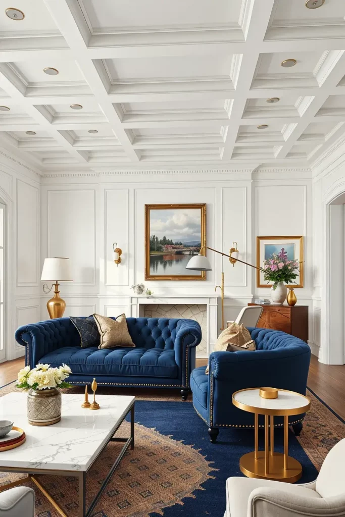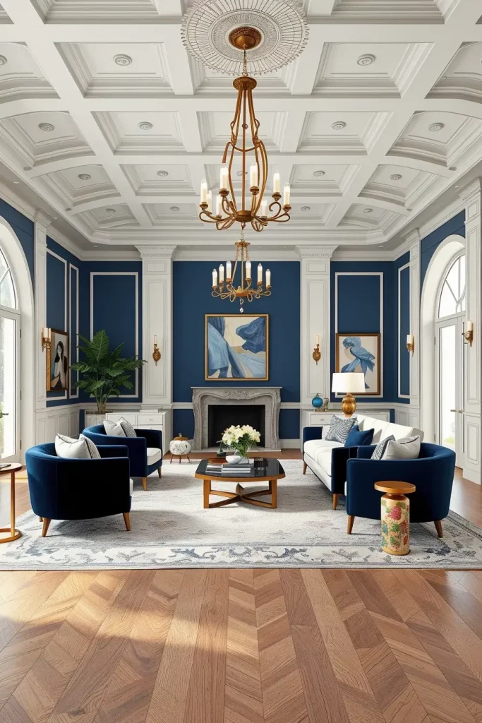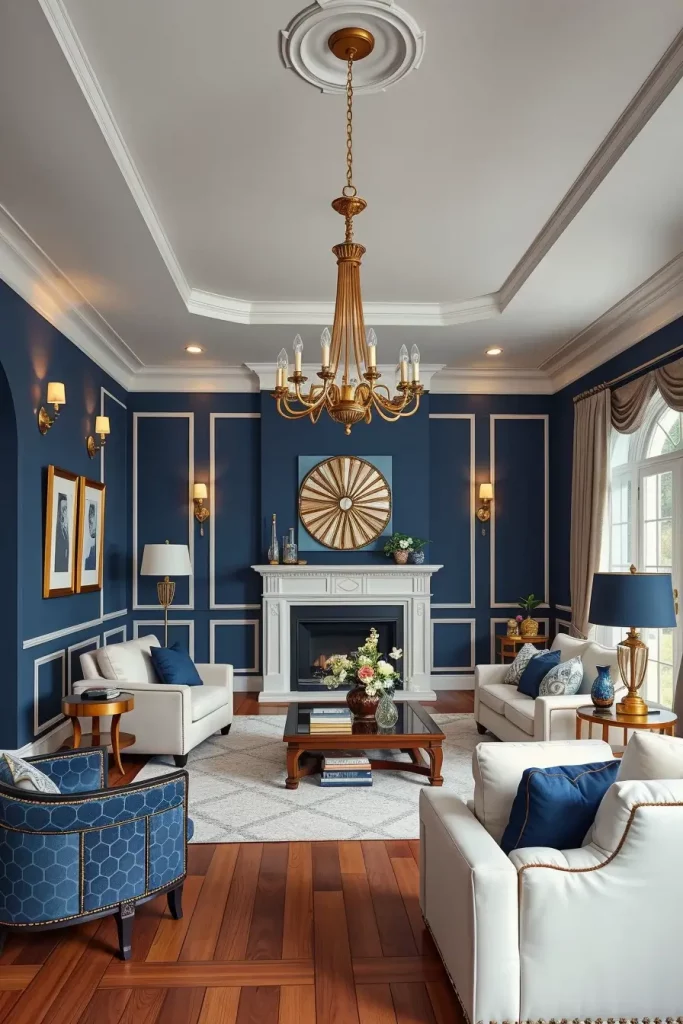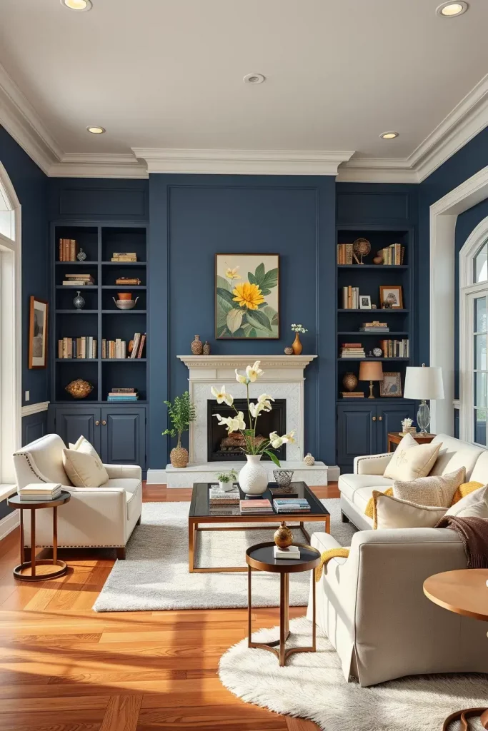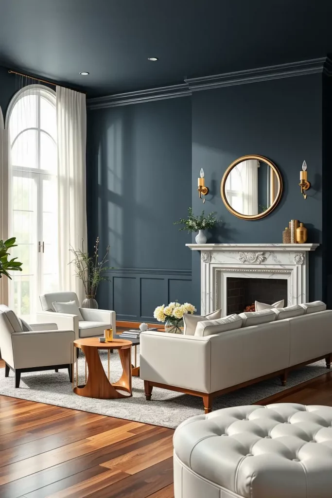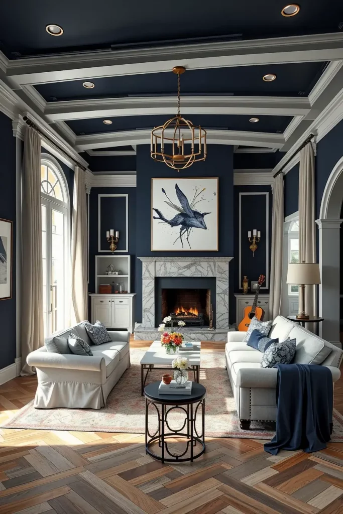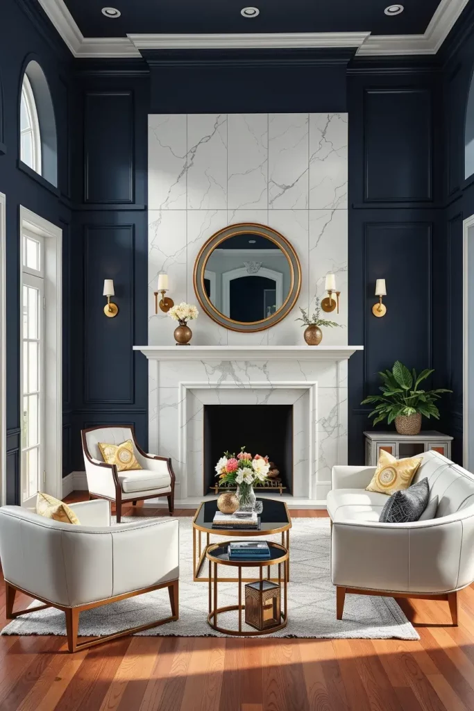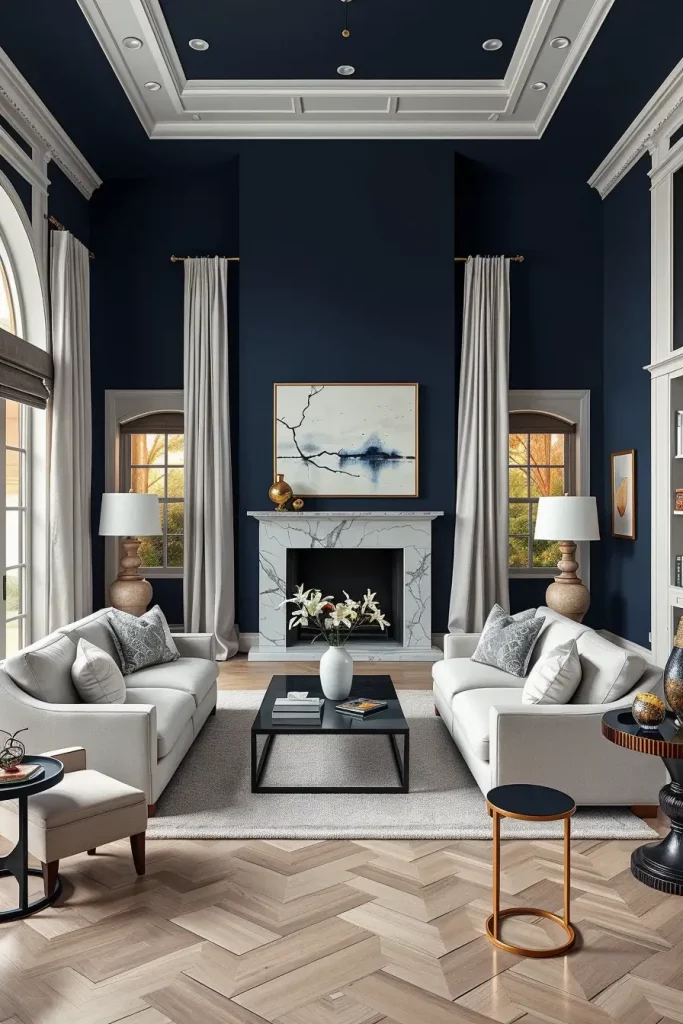 The first step should include a deep saturated navy paint application on walls and possibly the ceiling. White trim elements and white furniture pieces help distribute the depth and introduce visual depth. The design typically includes white linen sofas along with black wood coffee tables and layered navy drapery. White marble elements which appear in fireplace surrounds and decorative items serve to enhance the room’s atmosphere.