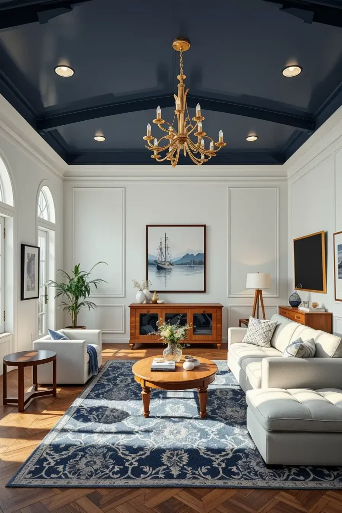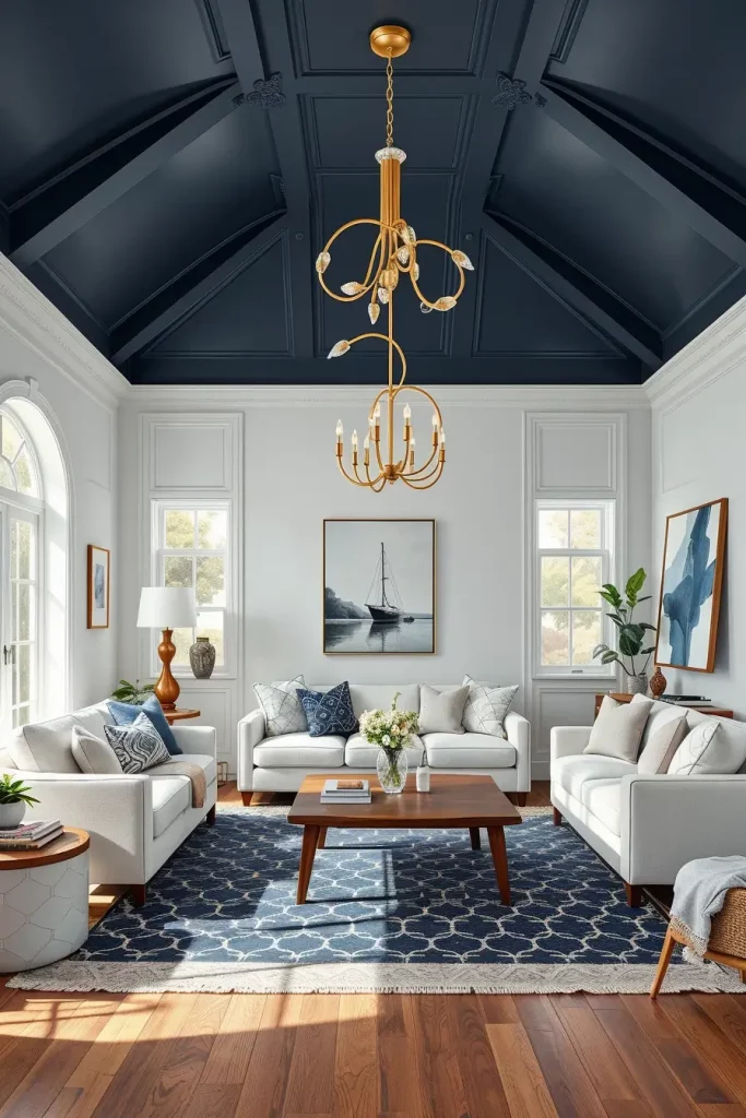 The furnishings I choose include sculptural white pendant lighting or chandeliers which become visible against the dark ceiling. The white linen sofa and navy patterned rug along with simple artwork allow the ceiling to become the main focal point. Wooden coffee tables along with side chairs smooth the bold contrast by providing organic textures.