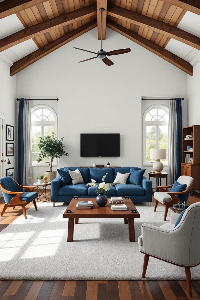 This design concept requires a substantial geometric-patterned area rug made from navy and white colors. The diamond shapes together with trellises and chevrons make the best design choices for this pattern. These patterns enhance the room design by both pointing out the colors and developing visual pathways that extend across the complete space. A white modern sofa and a navy ottoman coffee table pair beautifully with such a rug. The rug’s design elements appear again through patterned pillows that I pair with mid-century side tables.