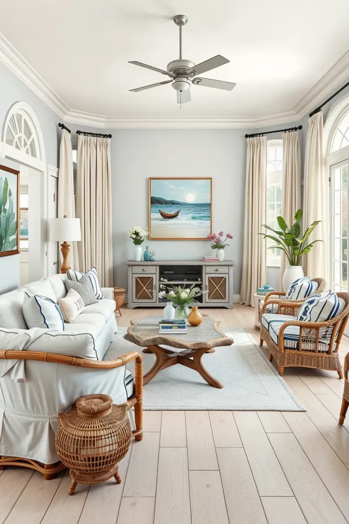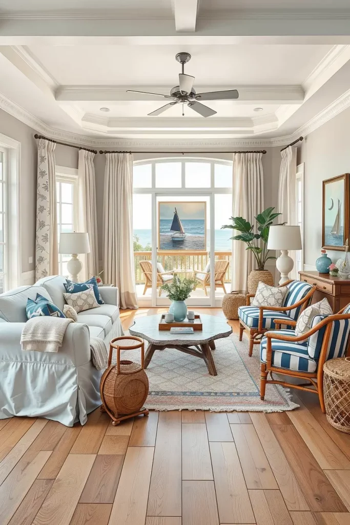 The best way to achieve this style depends on allowing natural light to take center stage. Baskets and rope mirrors provide depth to rooms without adding noticeable mess. Coastal Living Magazine suggests using pale gray or sandy beige with navy to prevent harsh color contrasts while I fully support this recommendation.