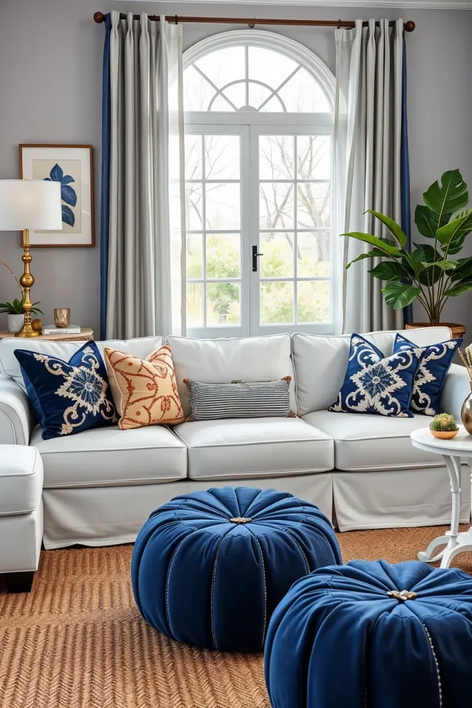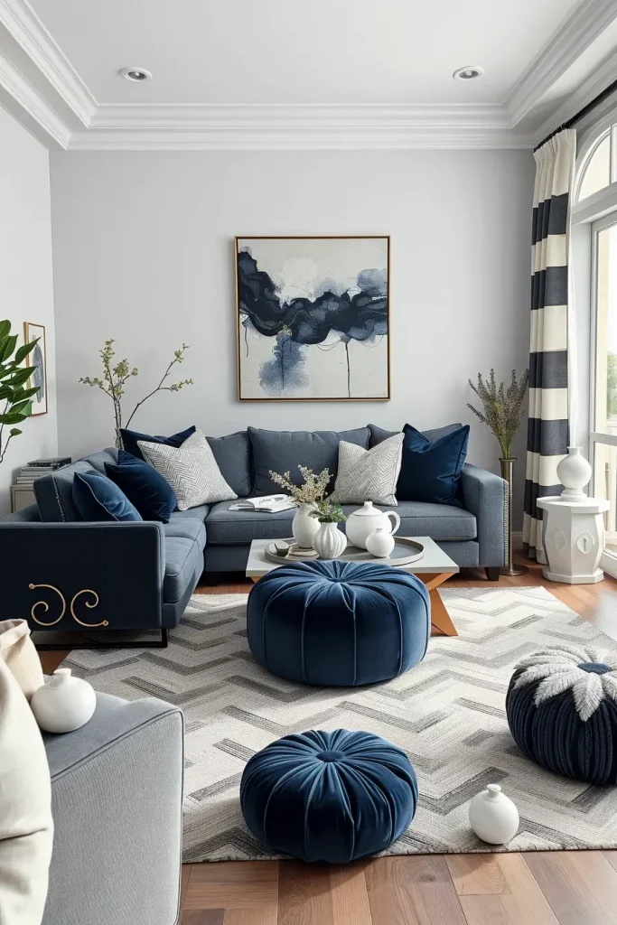 The first step in wall painting involves using white or soft gray before placing a navy sectional sofa. I introduce depth to the area through velvet and linen and embroidered fabric cushions that utilize only navy and white tones. The room establishes its base through a chevron rug that unites navy and white colors while geometric or striped drapes frame the windows. White ceramic items integrated with various navy layering as well as texturized navy poufs will enhance the depth.