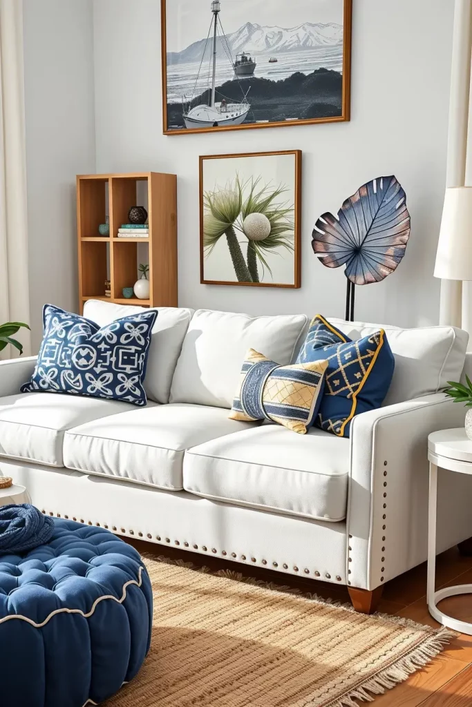 Navy and white throw pillows provide an easy way to experiment with these colors and I use them to change room aesthetics throughout the seasons. The base is a white sofa which I complement with different navy cushions featuring floral patterns or stripes or embroidered designs.