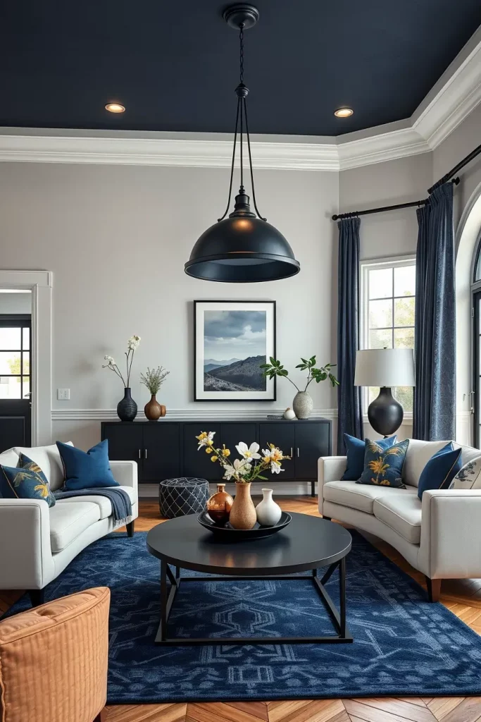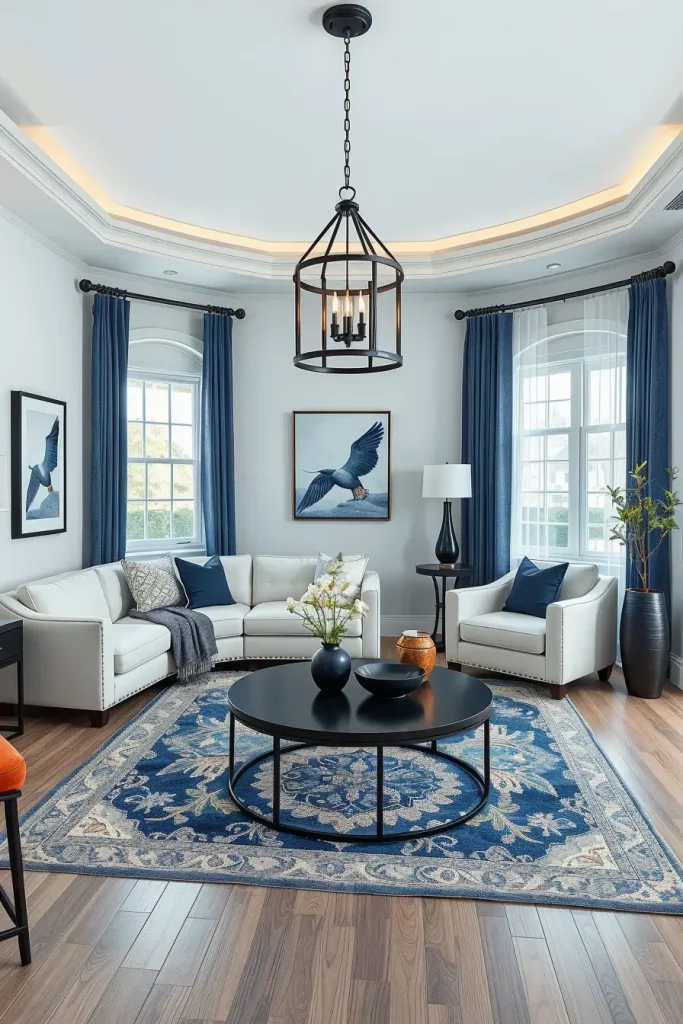 Navy and white living rooms succeed from black accents which simultaneously anchor the space and introduce contemporary appeal. The dark elements in the room establish visual contrast which enables the transition between navy blue and white color schemes. The design achieves refined elegance through this method without needing an additional color beyond navy and white.