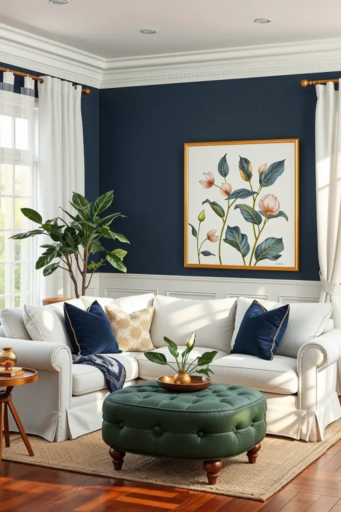 This is one of my favorite ways to use navy and white in a living room—creating a high-impact contrast by placing white furniture against a deep navy accent wall. Through visualization one can instantly create complex spatial depth which gives incredible impact to spaces. Small spaces gain dramatic transformations through this technique although they do not become dark.