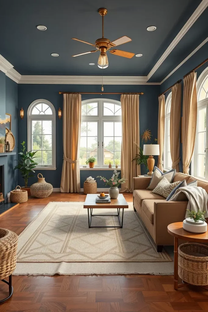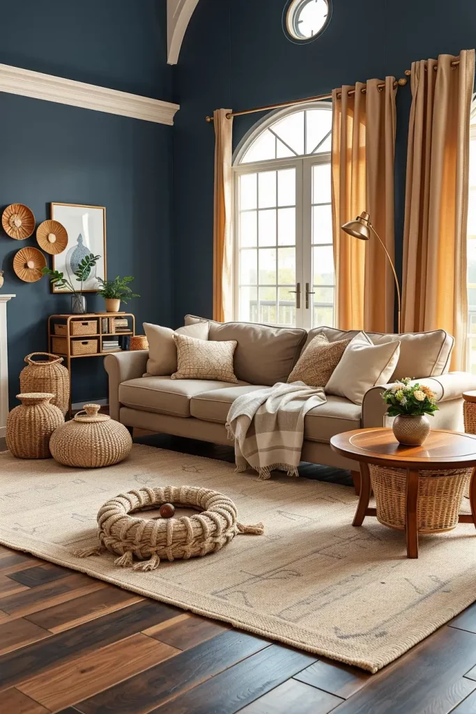 I base my design on beige through linen area rugs and oatmeal-toned curtains and sand-colored sofas placed against navy walls. A navy sectional receives cohesion through beige throw pillows and a white and beige striped blanket. The relaxed atmosphere becomes stronger when beige appears in natural elements such as rattan baskets and raw wood furniture.