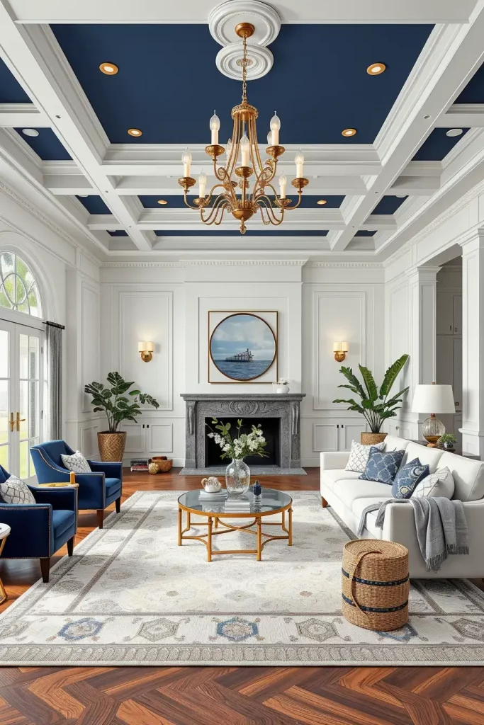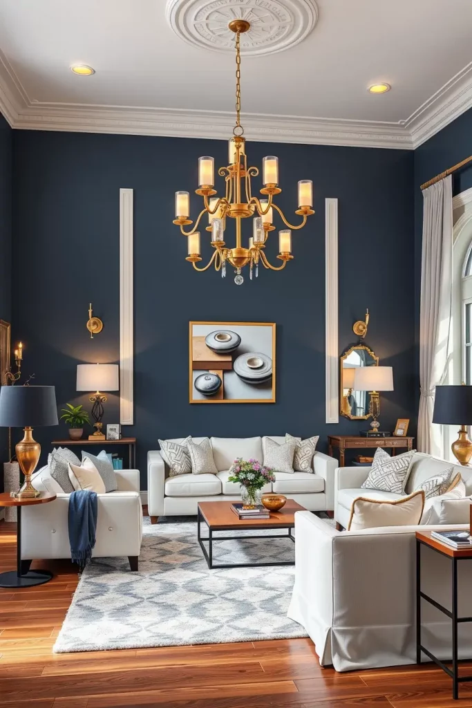 A statement chandelier stands as one of the most powerful transformations that can occur in a navy and white living room. Design extends beyond eye level according to my recommendation to clients. The room achieves a sophisticated appeal through chandeliers which enhance its total impression while adding sophistication. A navy and white room gains dramatic appeal through an elegant chandelier which unites crisp white elements with deep navy tones.