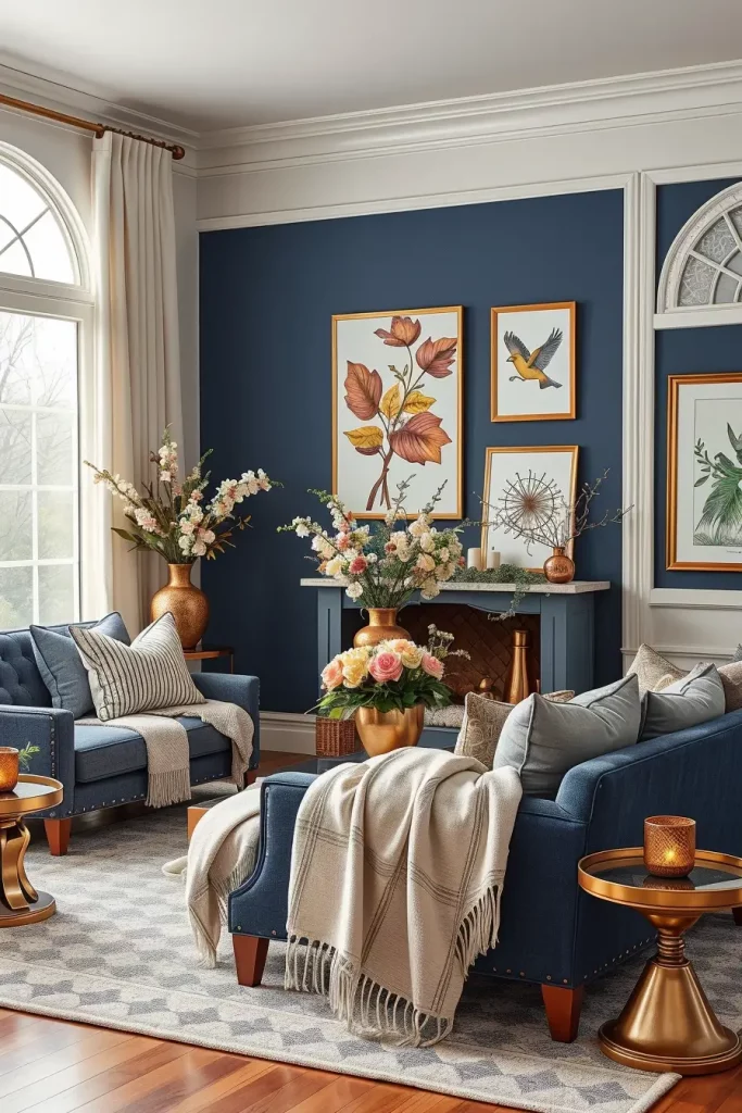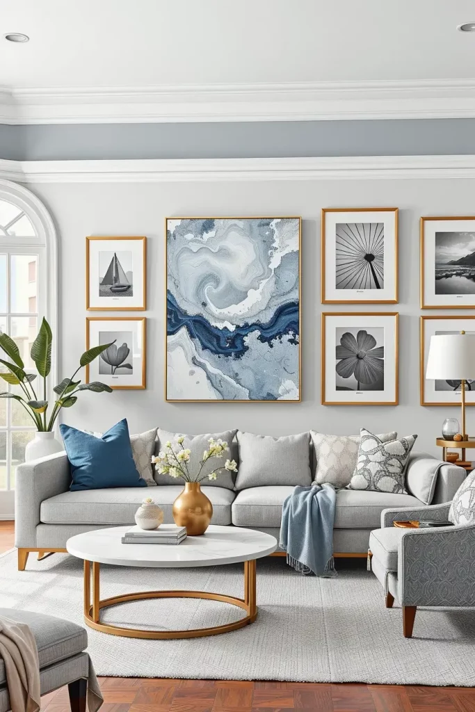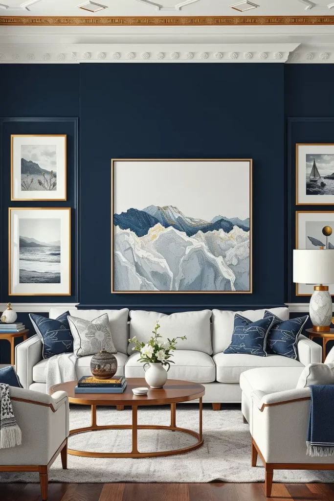 Big white-framed black-and-white photographs along with abstract navy and gray canvases and coastal-themed prints work perfectly for navy-colored walls. White walls require navy geometric or botanical prints displayed in gold frames to direct attention. The combination of differently textured art pieces such as textiles and framed words and trame mirrors creates depth while manufacturing an artistic selection.