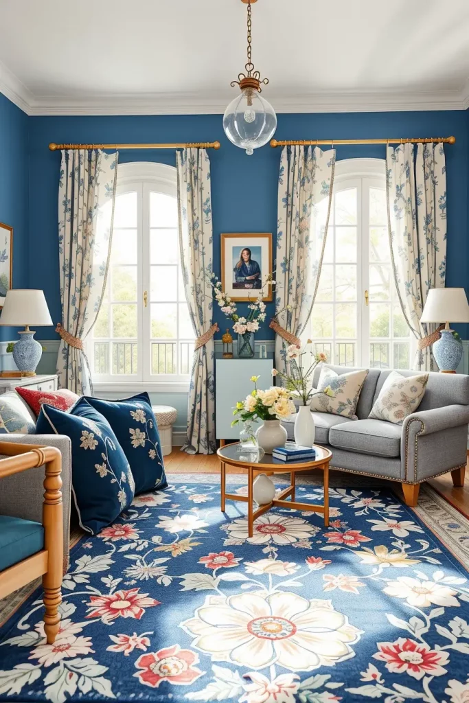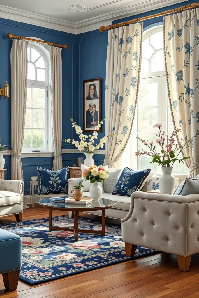 The foundation of my designs starts with placing either a navy or white floral area rug. White drapes featuring soft blue vines can be hung while navy throw pillows with white embroidered blooms serve as additional decorative elements. Fresh-cut flowers in ceramic vases—hydrangeas, peonies, or eucalyptus—act as both decoration and natural fragrance.