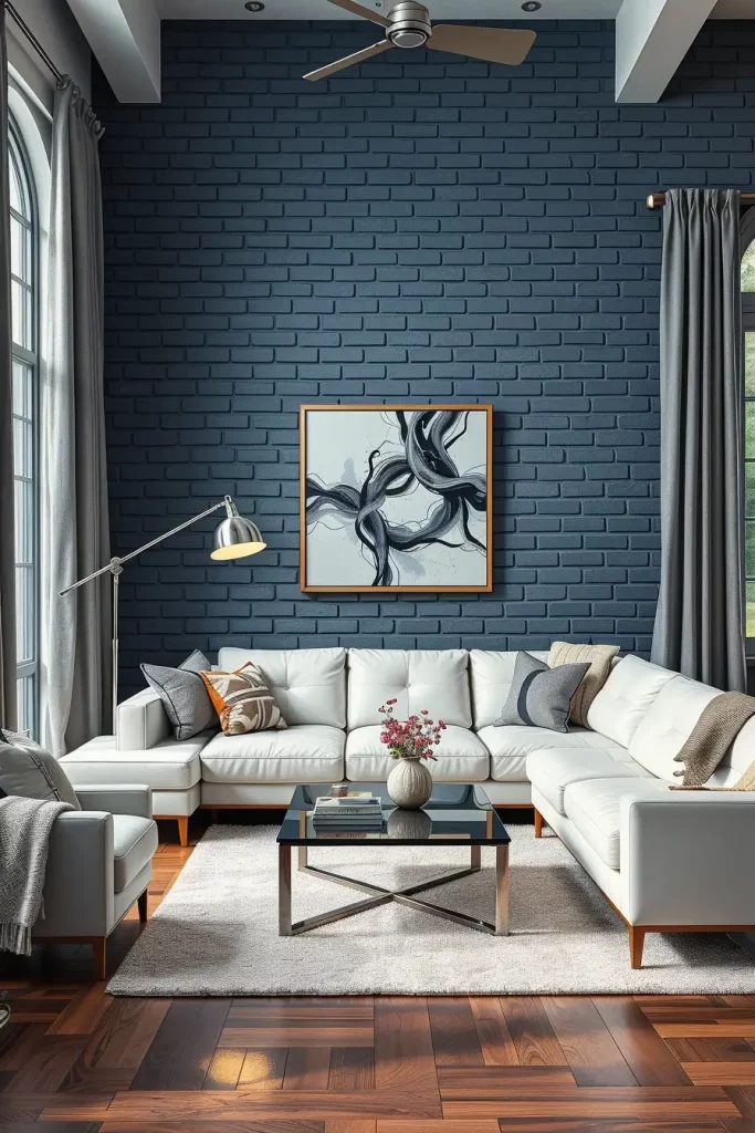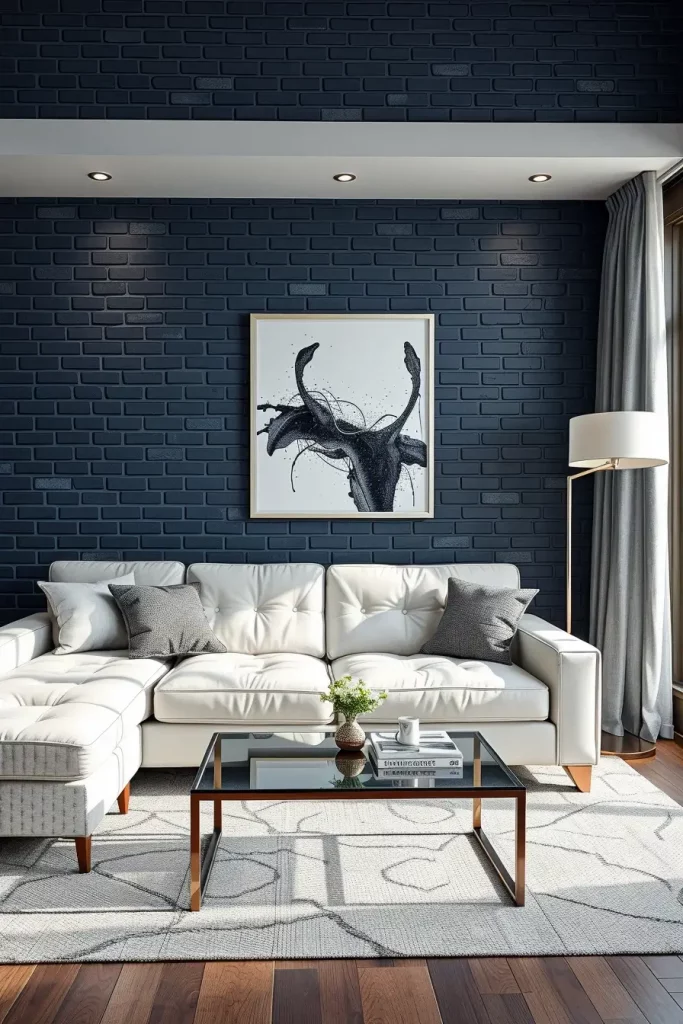 I combine contemporary white furniture with navy brick walls in modern spaces by choosing minimalistic white leather sections and clear glass tables and chrome floor lamps. The wall’s texturing becomes visible through the contrasting effect which creates a bright atmosphere in the room. The urban chic style comes together through my use of light gray curtains with abstract black-and-white artwork.