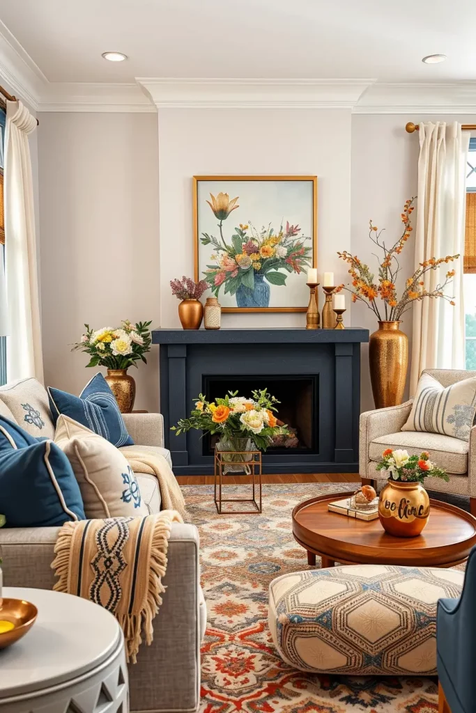 I would enhance the area by placing fresh white orchids on the coffee table as well as positioning two navy blue ceramic stools next to the fireplace to provide visual appeal and functional benefits.
