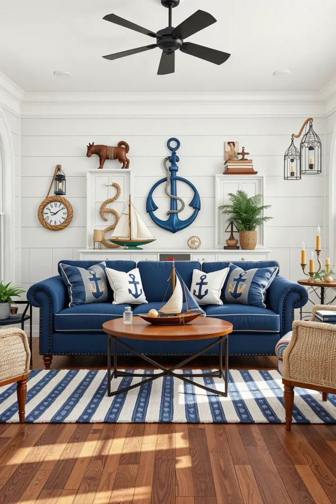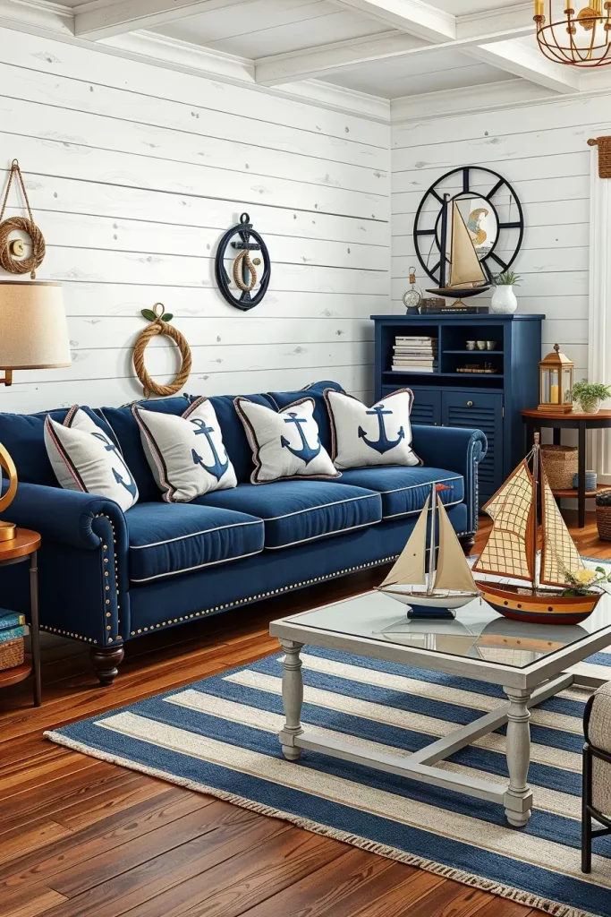 Your cottage design begins with white shiplap walls and ceiling beams that receive a white paint finish. The centerpiece of this design must include a navy blue sofa with white piping. The anchor-patterned pillows and model sailboats on open shelving along with lantern-style lighting fixtures are some of the elements I like to include. Nautical maps and navy striped rugs and rope-wrapped accessories serve as the main elements that complete the nautical theme. The aged appearance of a white coffee table creates vintage appeal and rough texture.