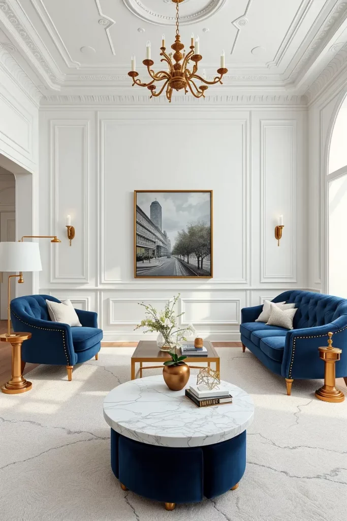 The design incorporates white marble coffee tables together with contemporary table lamps and geometric or floral navy rugs. The combination of gold and brushed nickel hardware creates an elegant touch in the design. The design finishes with black-and-white framed photos and oversized mirrors to achieve a sophisticated appearance.