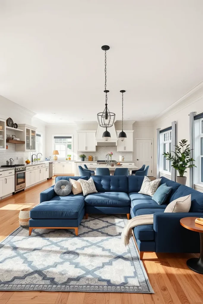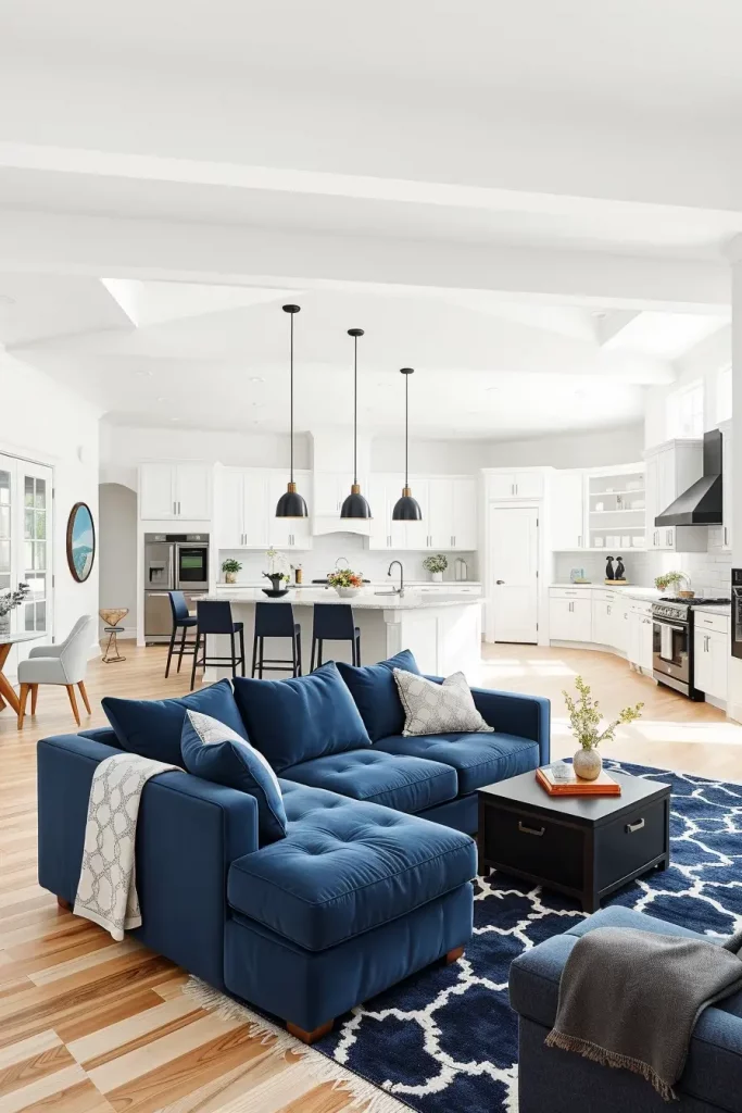 The seating area in this design will receive its foundation from either a navy rug or a navy sectional sofa while white walls and cabinets work together to maintain visual unity. The navy bar stools and pendant lights placed above the kitchen island serve to unite the different areas. The living area receives its own identity through color-blocking methods which include navy feature walls and navy drapes paired with white vertical blinds.