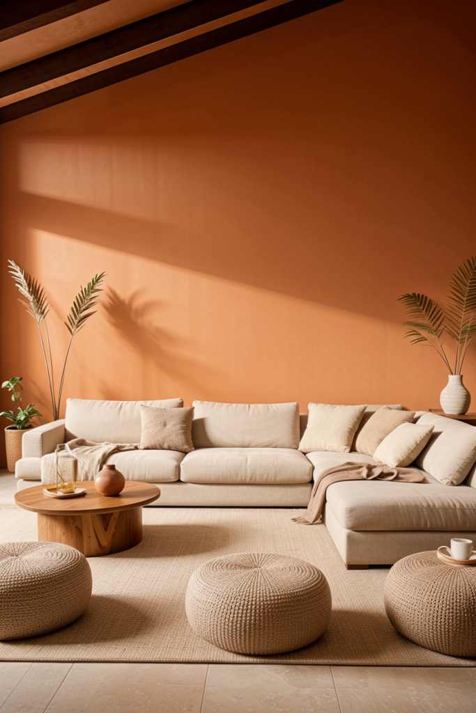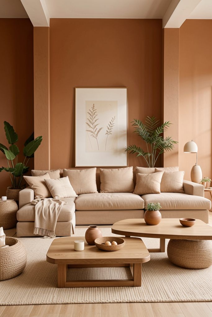 In 2025, living rooms are welcoming and balanced in harmony. Colors like terracotta, clay, warm beige, caramel and muted ochre all evoke an earthy feel while inspiring calmness and coziness. Wooden accents and woven textures work perfectly with these tones, while stone elements adds a grounded feel towards the space. Furthermore, designers use darker browns, olive greens, and rusty reds to create depth and warmth, which effortlessly works against overpowering the already set aesthetic.