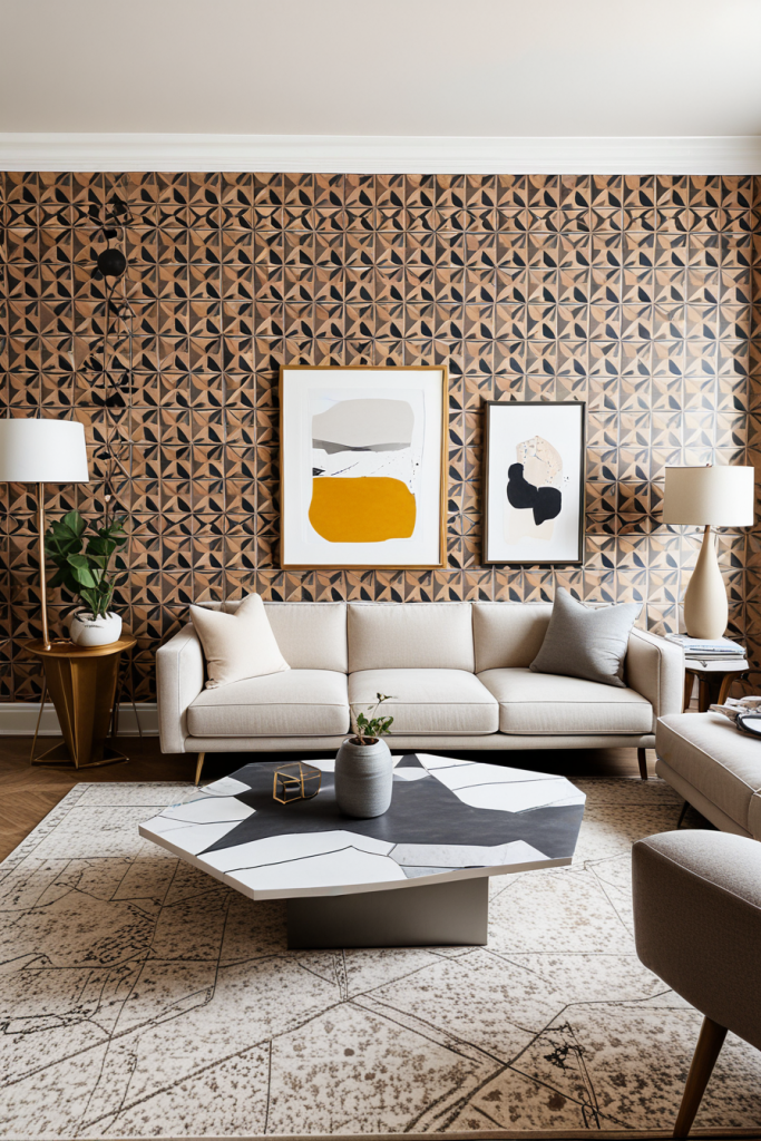 Playful and artistic patterns bold designs showcases great looking 2025 living rooms. This trend is characterized by abstract rugs, statement throw pillows, geometric wallpapers, and creative accent walls. Along with that, checkerboard floors, hexagonal shelves, and zigzagged textural surfaces are other geometric shapes which give illusion of movement. To keep overwhelming feelings at bay, the neutral furniture with these elements creates harmony.
