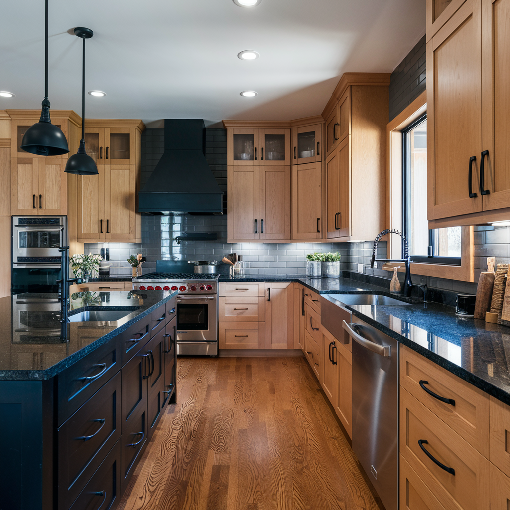 Oak Kitchen Cabinets with Black Accents