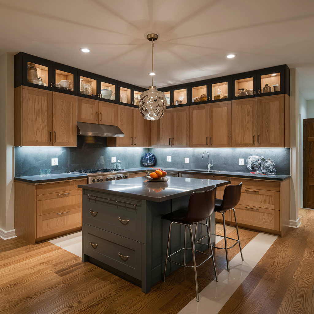 Oak kitchen cabinets with black accents are a striking and contemporary mixture that will up the look and sophistication of the space. Black hardware, countertops, or an island used along with the natural oak cabinets will be a powerful visual statement. This interconnection is likely to be effective in both modern and rustic rooms and at the same time it manages a blend of warm and modern. The black color contrasting the light wood is the element that stabilizes the area by adding some formality to the natural but warm oak.