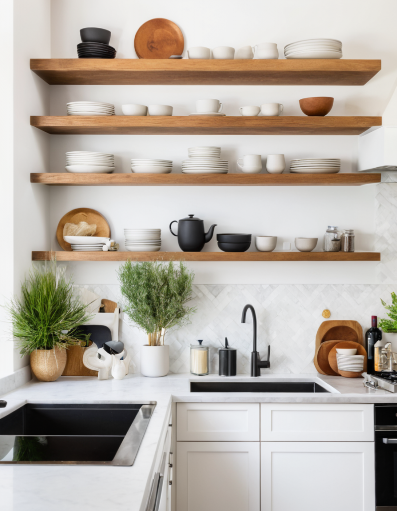 Shelving is one of the most effective ways in which you can add storage in a small kitchen without making it look cramped. The idea of the open shelving with the summer crockery or glasses zesting the look combined with the opportunity to efficiently get anything you need to eat practically turns the kitchen into a whole universe. Is designed according to the way the sun shines on the home, this building can be ideal even for winter. The invisible effect of these shelves, which have the same color as the walls, complement each other, while wooden shelf units, in contrast, help make the place cozier.