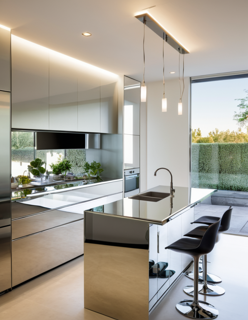 Introducing mirror is a design technique that changes the appearance of a small kitchen to a larger one and a brighter one as well. A mirrored backsplash or reflective surfaces on cabinets can bounce light around the room, creating the illusion of more space. Beside the mirror on the wall or over the countertop, the modern kitchen becomes more diversified. In addition, mirrors, in the form of modern elements, not only meet their purpose, but they also contribute to the general chicness of the design.