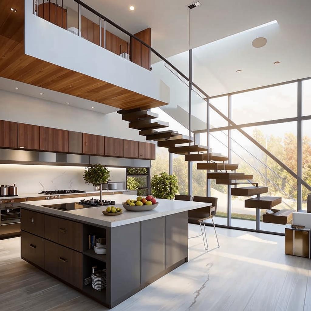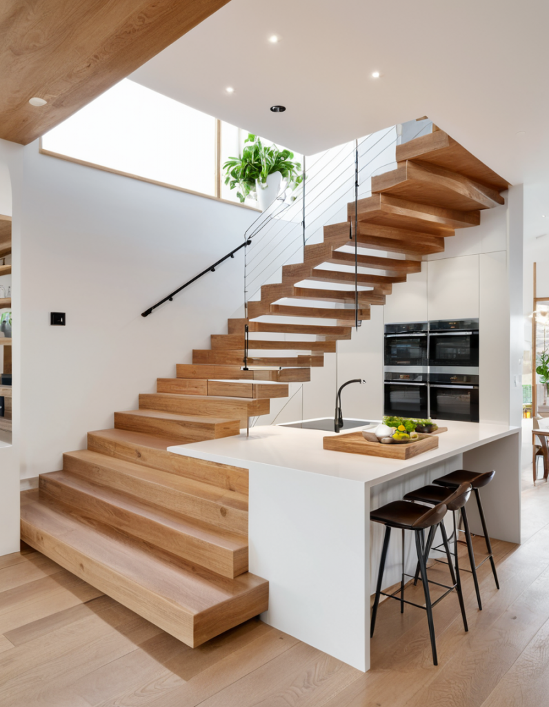 Open kitchens with staircases seem to be the new choice of decorations in 2025. This trend is particularly evident in homes where kitchens are found on the main floor. The stairs can produce a striking effect on the design when constructed with the open or floating stair technologies, both of which have a strong spatial presence. The island can be put at a place next to the staircase to make an easier transition moving up or down the stairs.