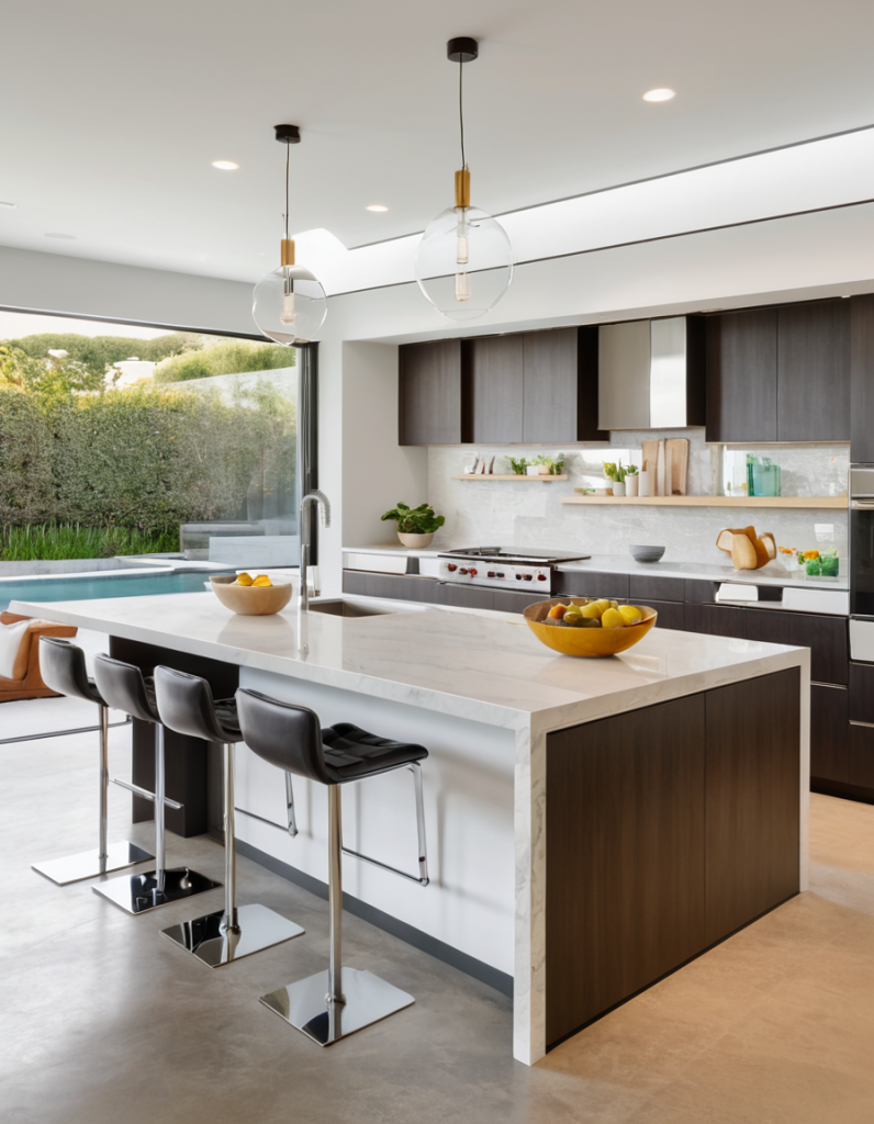 With the help of the selection of contemporary materials, the creative remodeling of an open-plan kitchen will add a great part to its general image and characteristics. Quartz and granite are the natural stones chosen as countertops that are still the most popular ones for their durability and luxurious look. Matte finishes give the furniture and countertops an atmosphere of contemporary, absolute clarity. Glass is a transparent element, so to speak, that will add openness to the room. Metal fixtures such as brass or stainless steel are also used to add a classy touch to cabinetry and hardware and give the whole room a sophisticated look.