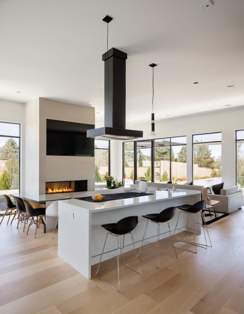 Integrating an Open Living Room with a Fireplace in an Open Kitchen Design