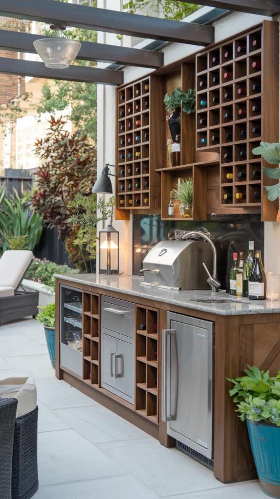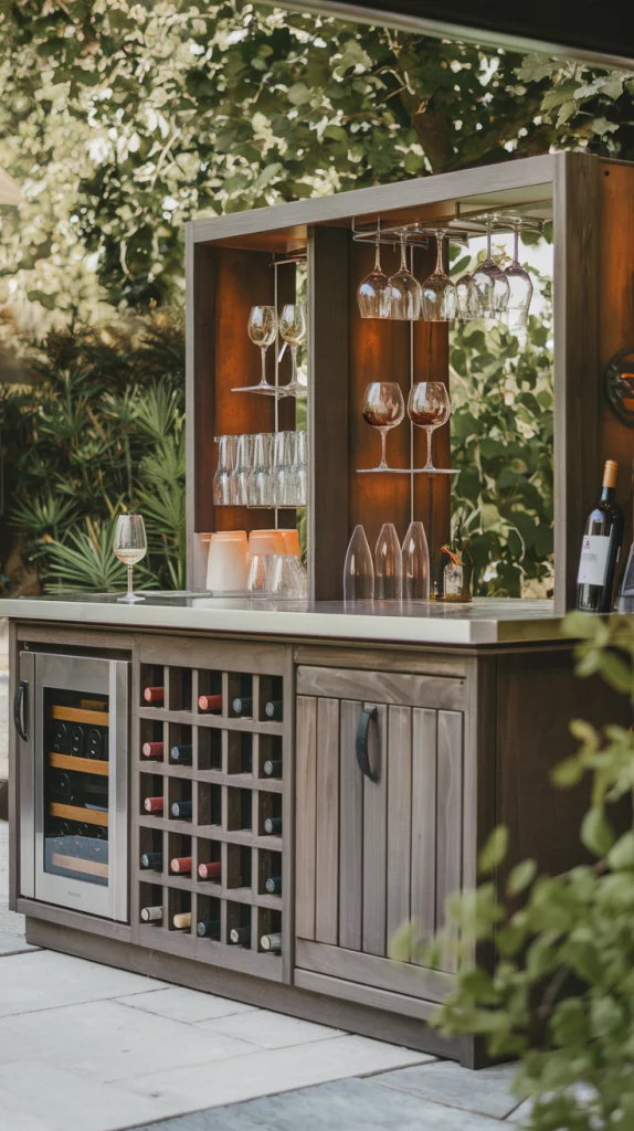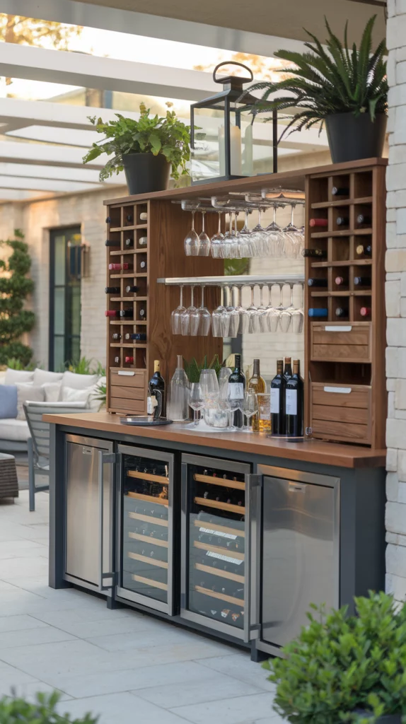 Incorporating wine racks and storage into your outdoor bar adds both style and functionality. Use built-in wooden racks for a rustic look or opt for sleek metal designs in modern setups. Include compartments for glasses, tools, and other bar essentials, keeping everything organized and accessible. This setup is perfect for wine enthusiasts and cocktail lovers alike.