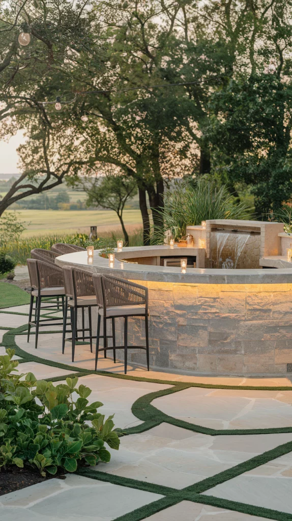 Built-in seating provides a seamless and comfortable outdoor bar experience. Incorporate stone or wood seating areas around the bar, complemented by cushioned benches or stools for added comfort. Include a shaded pergola or canopy for all-weather use, making the area both functional and stylish.
