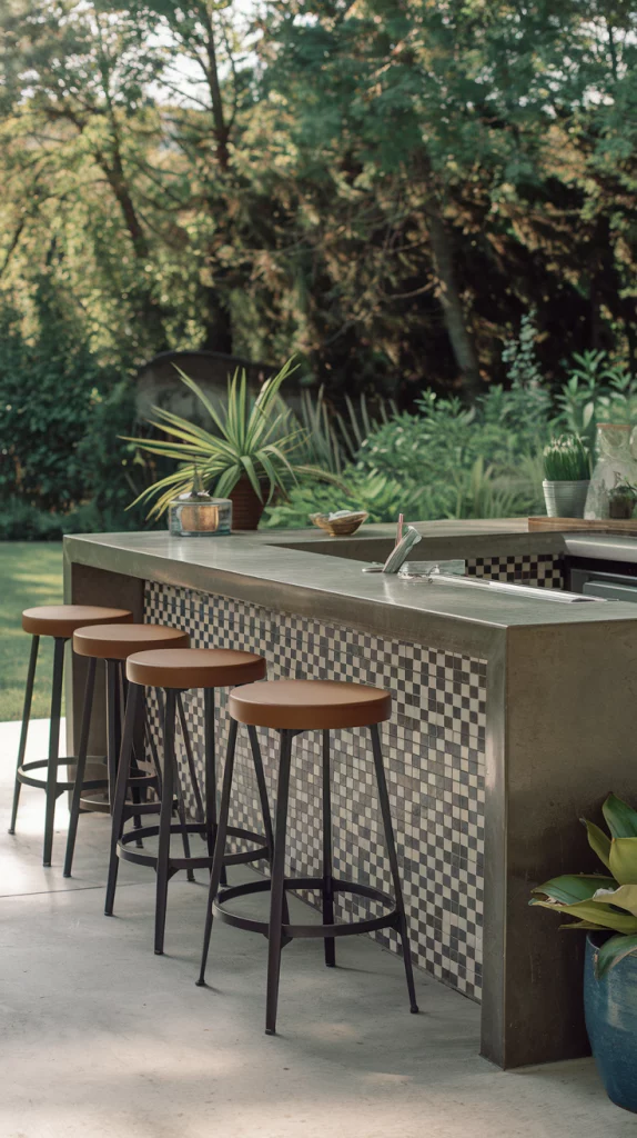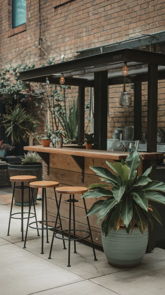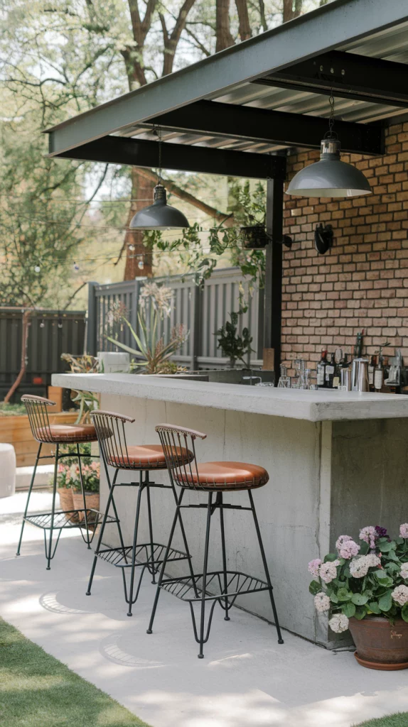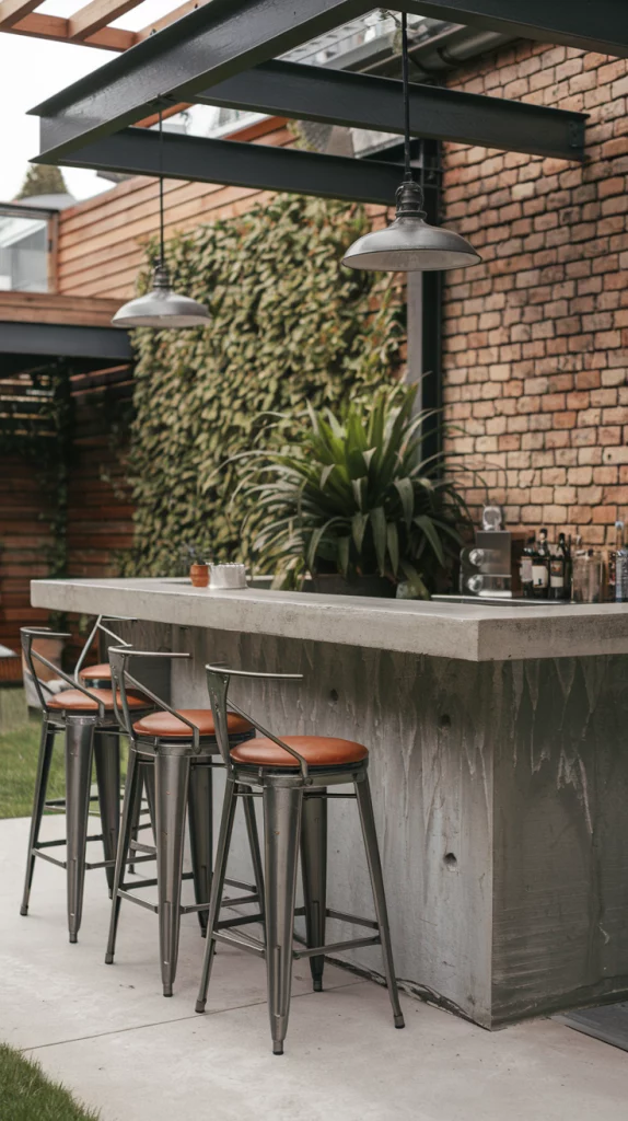 Industrial-style outdoor bars are perfect for those who love bold and modern aesthetics. Use materials like concrete, steel, and exposed brick to create a raw yet stylish look. Add metal stools with leather cushions and pendant lighting for an edgy vibe. This design is ideal for urban settings or those who prefer a unique, contemporary touch.