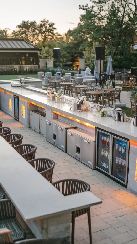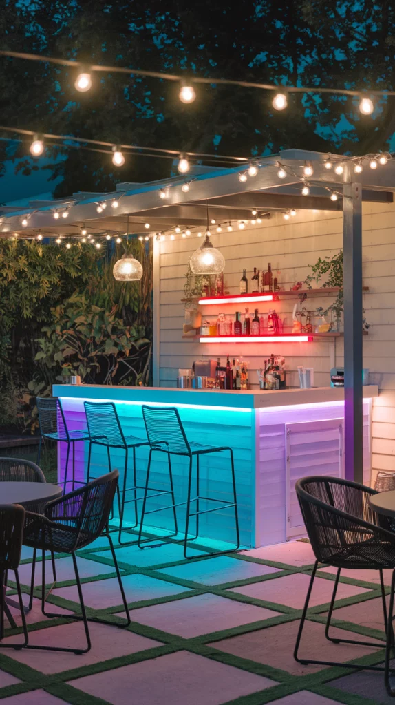 Custom lighting elevates the atmosphere of your outdoor bar, especially for evening use. Use LED strip lights under the counter, pendant lights above the bar, or string lights around the area. For a unique touch, consider color-changing lights that can be adjusted to fit the mood or event.