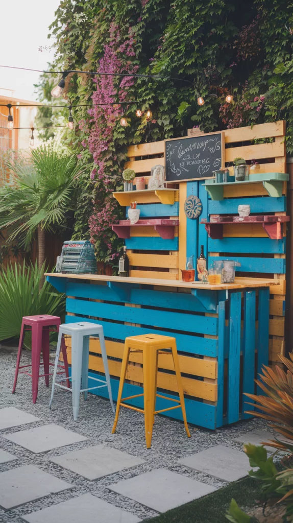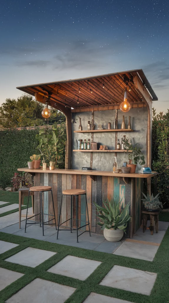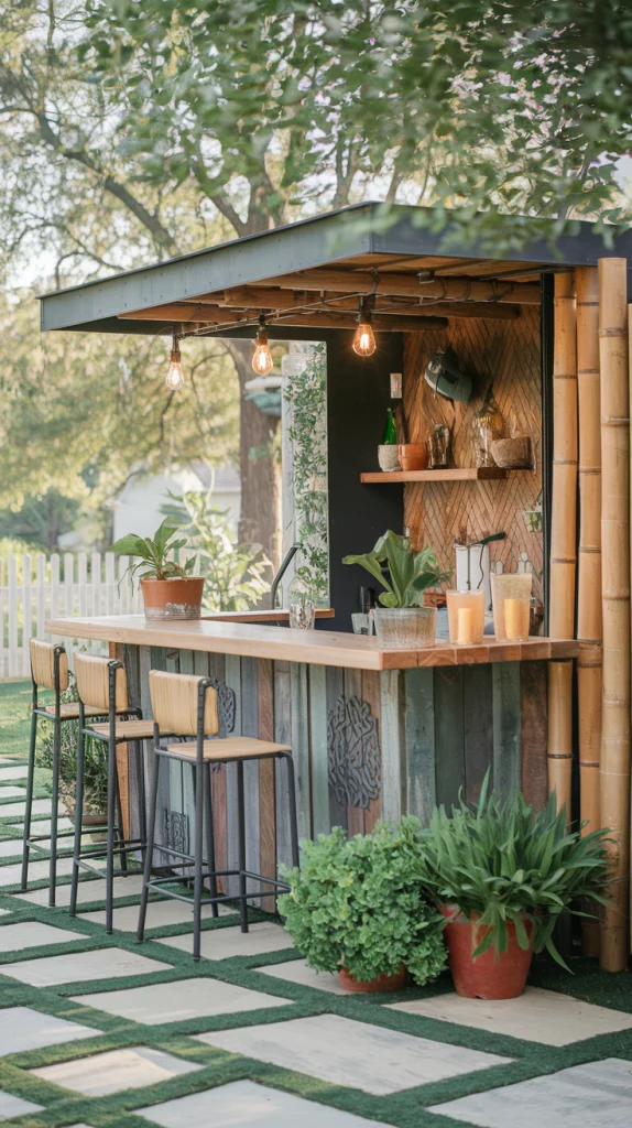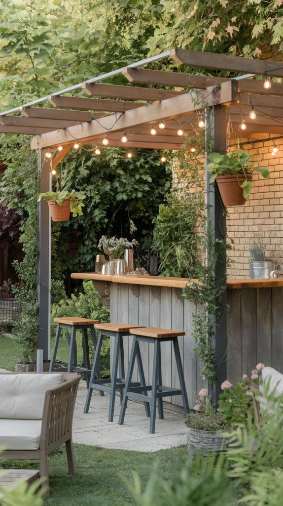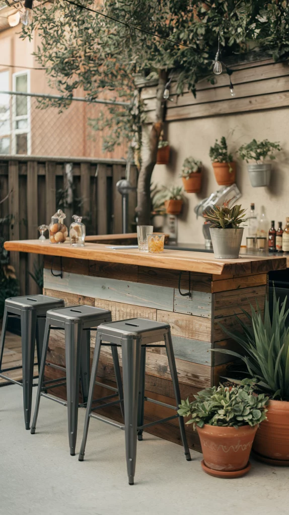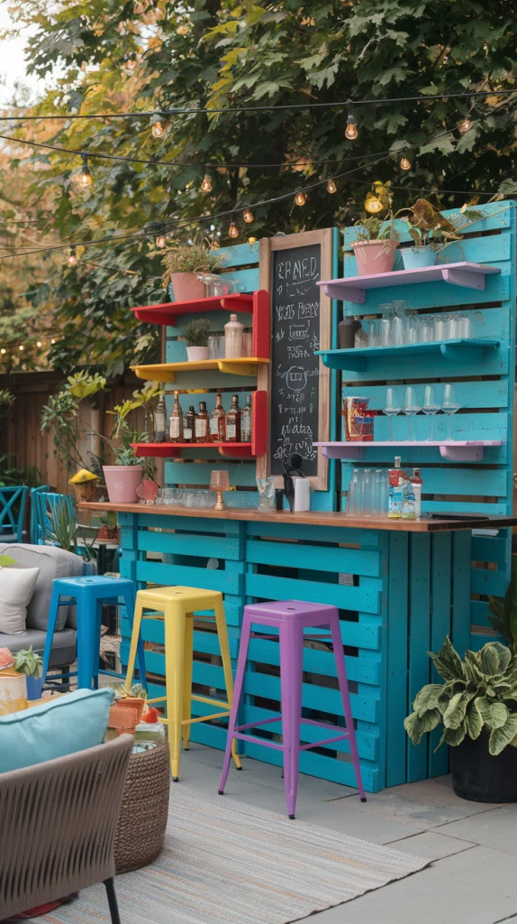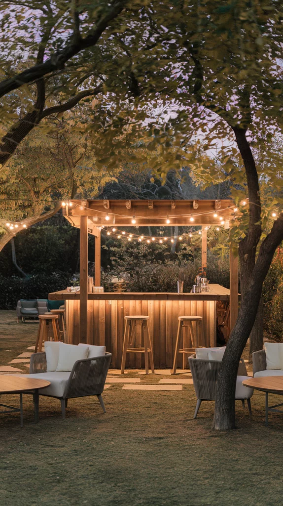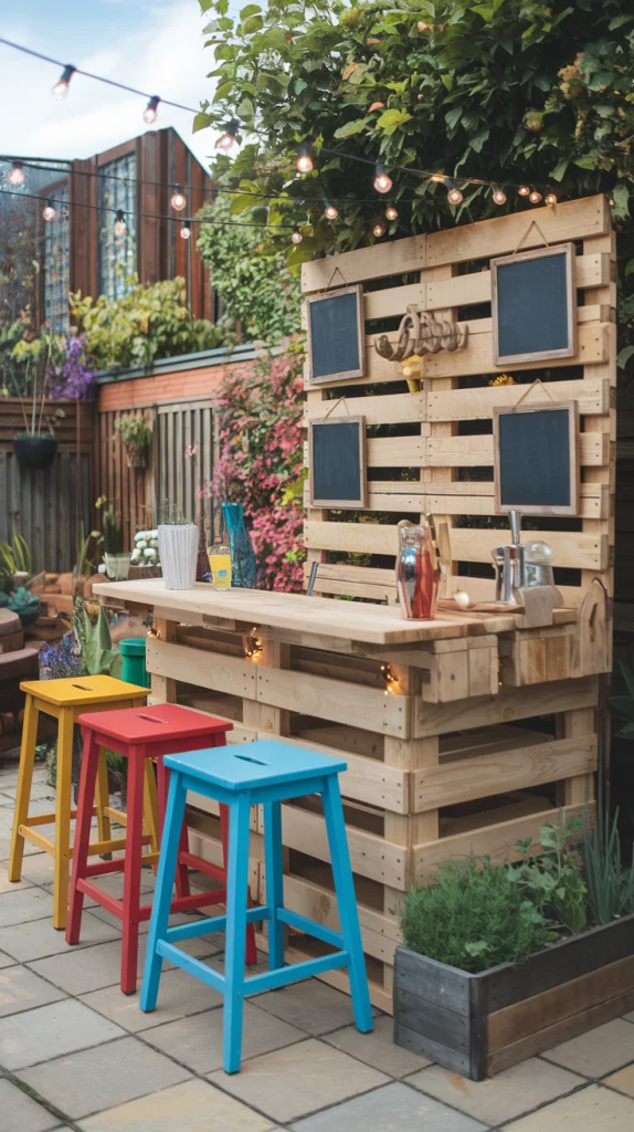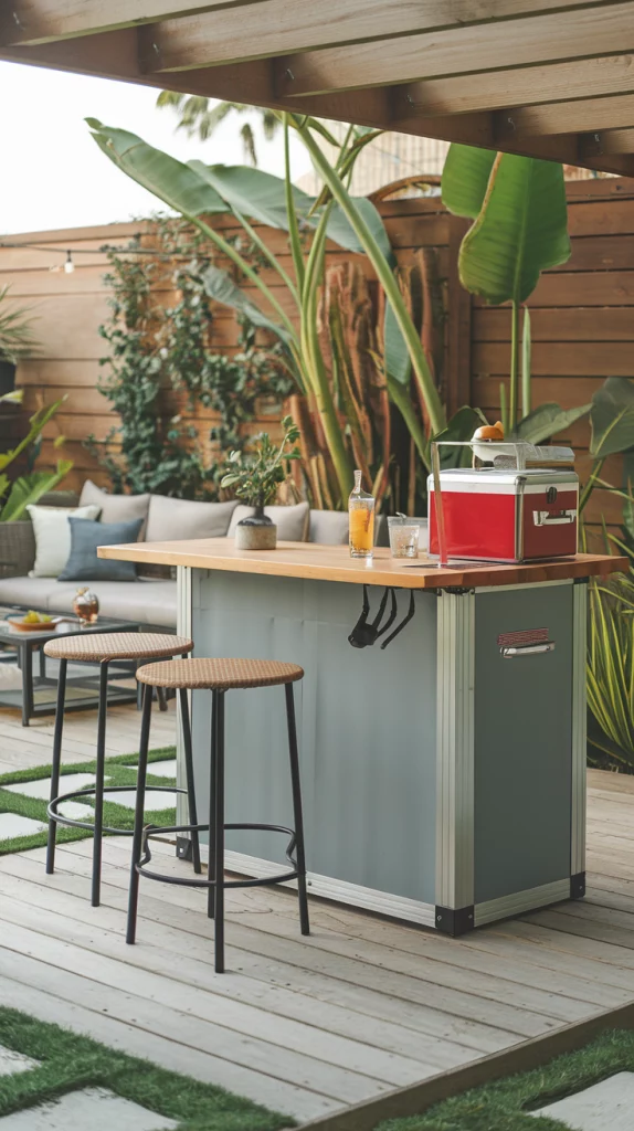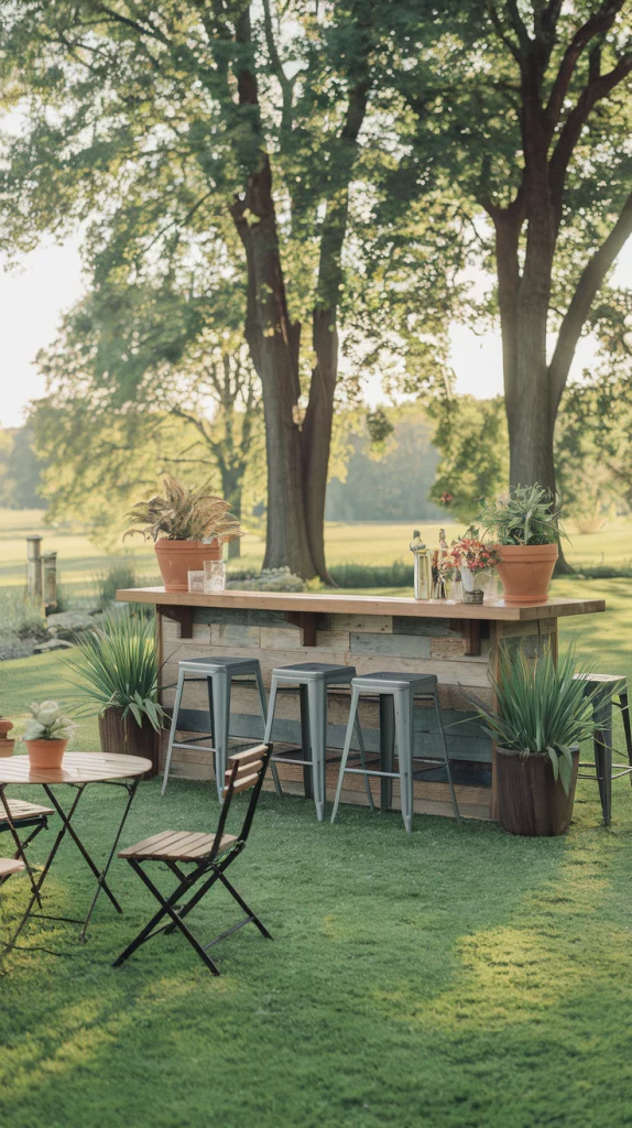 A DIY outdoor bar allows you to add personal touches while keeping costs low. Repurpose pallets into a bar counter, add colorful stools, and use chalkboard paint for a creative drinks menu. Hang fairy lights for an enchanting evening look. This option combines functionality with a sense of accomplishment, making your backyard unique.