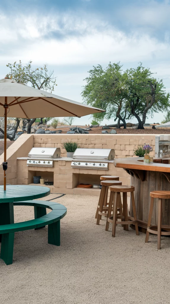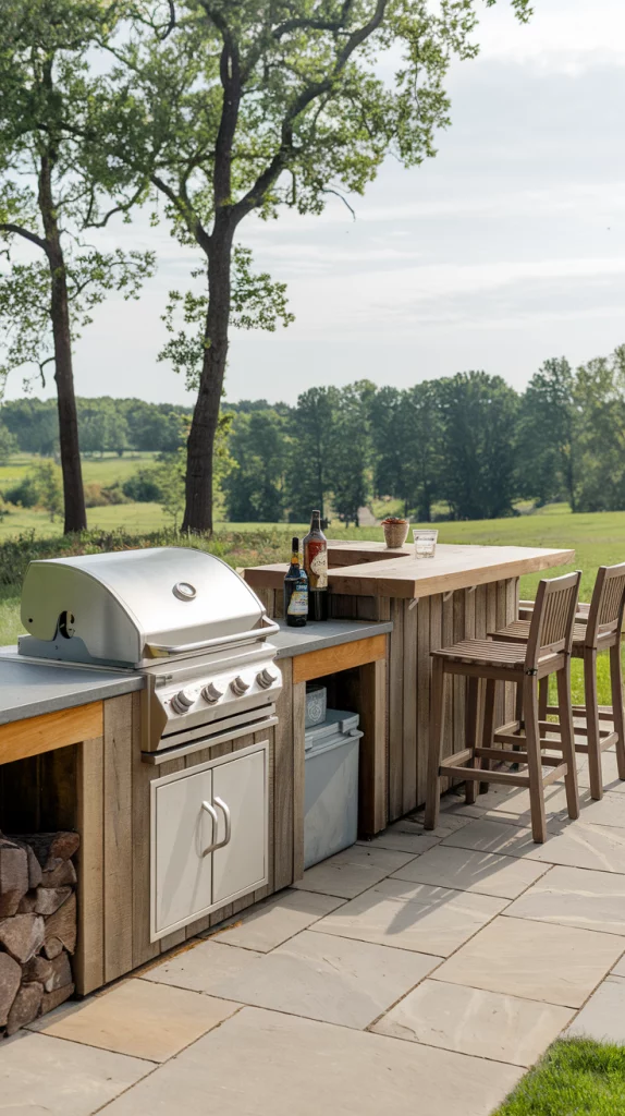 Combine your love for cooking and entertaining with an outdoor bar that includes a built-in BBQ grill. Use heat-resistant materials like stone or stainless steel for durability, and position the grill near the bar for seamless interaction with guests. Add a prep counter, storage space, and bar seating to complete this practical and stylish design.