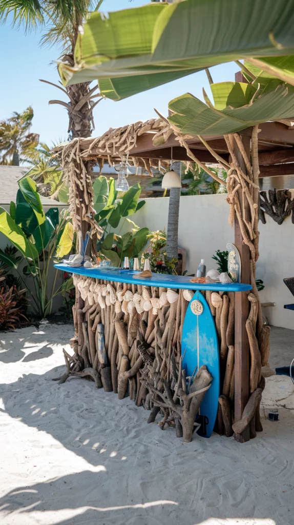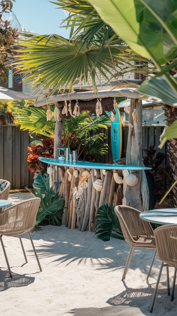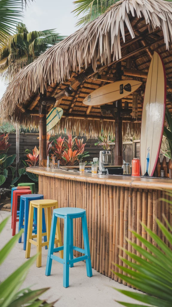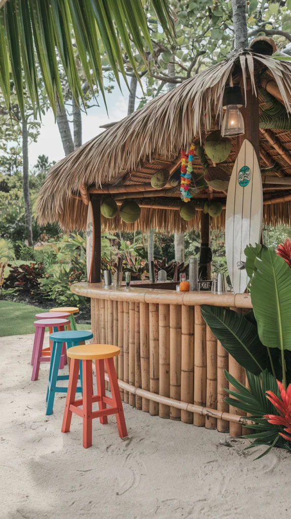 Transport yourself to a tropical paradise with a tiki bar. Bamboo materials, thatched roofs, and bright, tropical-themed decor create the ultimate backyard escape. Add a surfboard as a counter, tropical plants, and vibrant bar stools to complete the look. This setup is perfect for a fun and relaxed vibe.