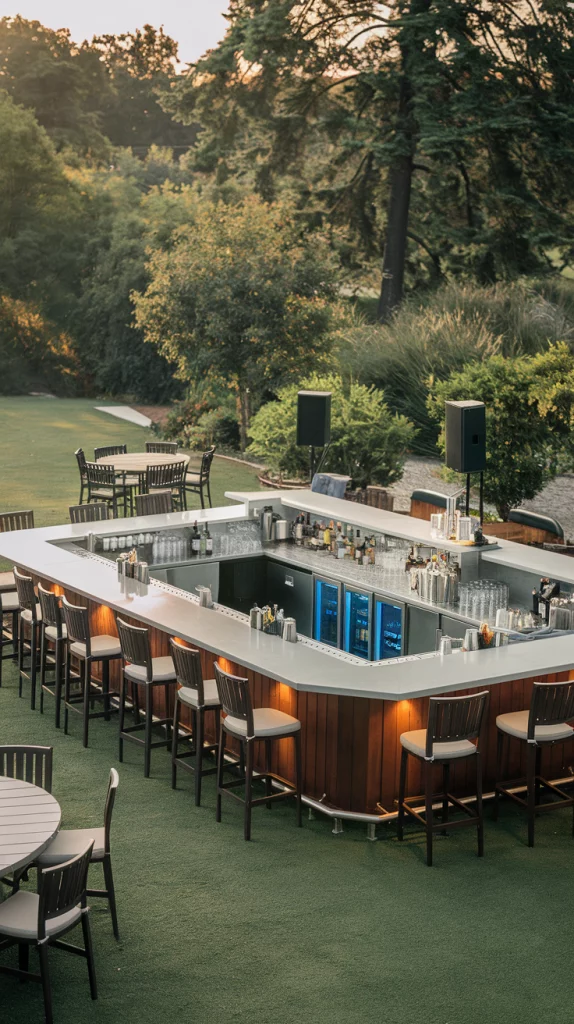 Eco-conscious outdoor bars use sustainable materials like reclaimed wood, recycled metal, or bamboo. Add solar-powered lighting and repurposed decor to emphasize your commitment to sustainability. This design not only looks great but also supports the environment.