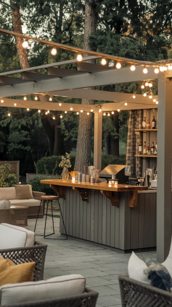 String lights can completely transform your outdoor bar into an enchanting retreat. Drape lights across a pergola or around nearby trees to create a magical, glowing canopy. Combine this lighting with a simple bar counter and comfortable seating to make the space perfect for evening gatherings. Adding soft, warm tones enhances the ambiance and creates a dreamy outdoor setting.