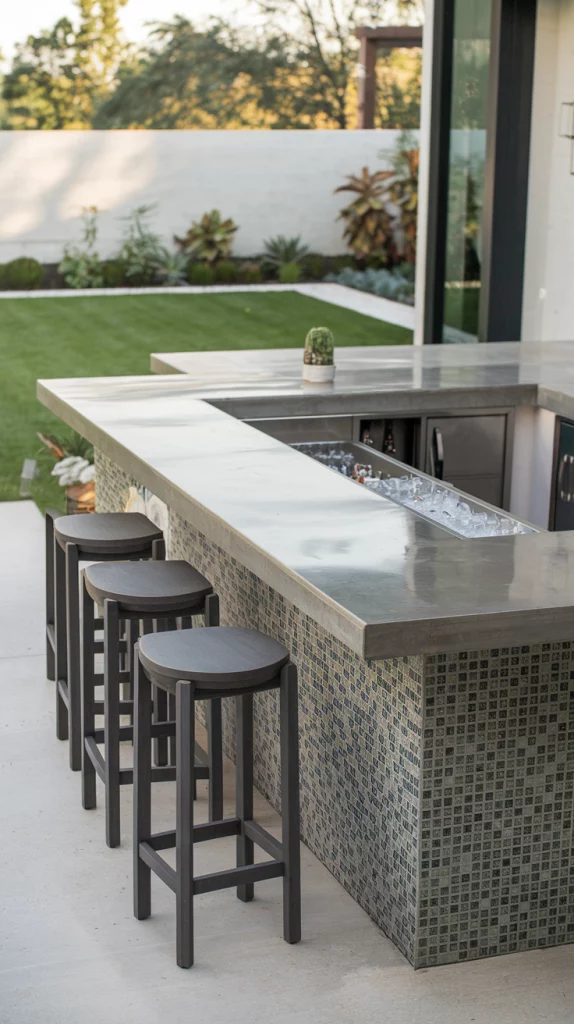 The countertop is a key feature of any outdoor bar and can define its overall style. Choose unique materials like polished concrete, granite, or even mosaic tiles for a standout design. Incorporate built-in features like an ice well or sink for added functionality. Pair the countertop with matching decor to tie the look together.
