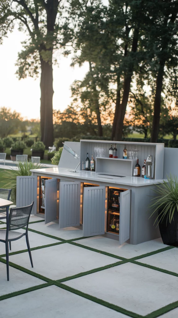 Even small urban patios can feature stylish outdoor bars with space-efficient designs. Consider a fold-out bar unit that doubles as a storage cabinet when not in use. Use bar stools with slim profiles and wall-mounted shelves for additional storage. Choose light colors and minimal decor to create an open and airy feel.