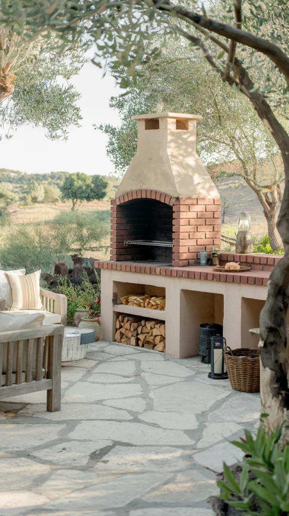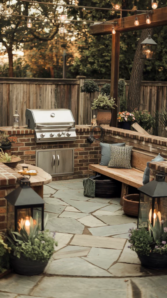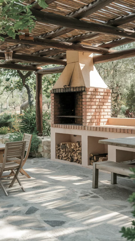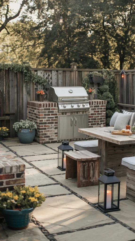 Rustic BBQ setups bring warmth and charm to any garden. Use natural materials like brick, stone, or reclaimed wood for the grill’s housing. Pair with wooden benches, lantern lighting, and earthy tones. Include decorative elements like firewood racks or potted plants to enhance the organic ambiance.