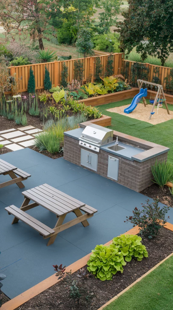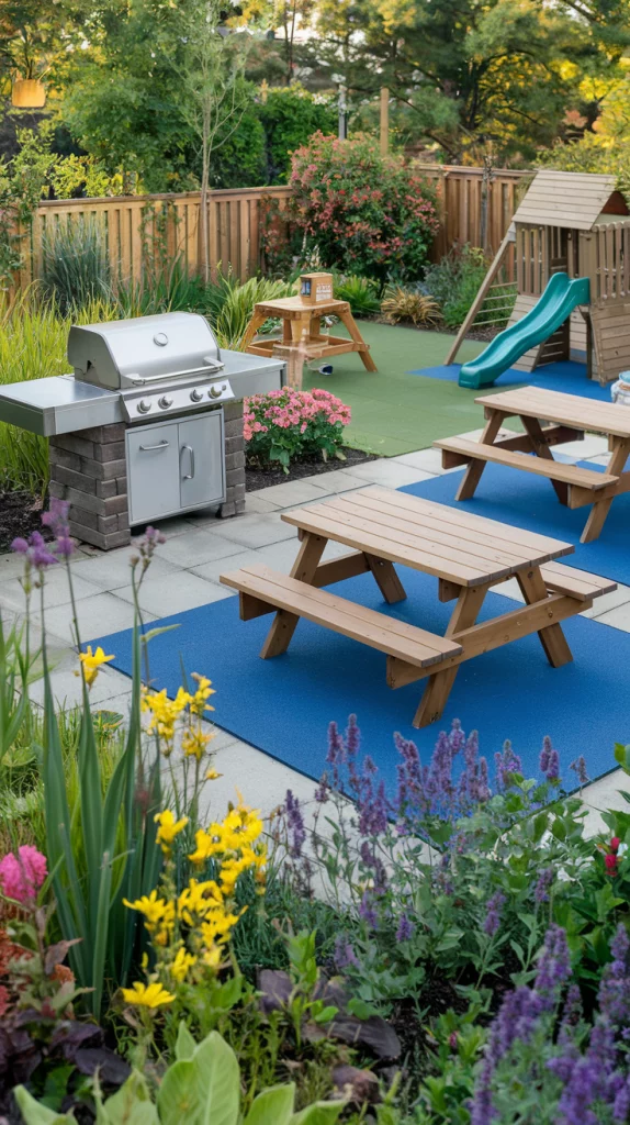 Creating a child-friendly BBQ area ensures safety and fun for the whole family. Include barriers or partitions to separate the grilling station from play areas. Add low-seating options, picnic tables, or benches that cater to children. Use soft materials like rubber mats around the dining space, and include kid-friendly features like a chalkboard wall or an outdoor games station.