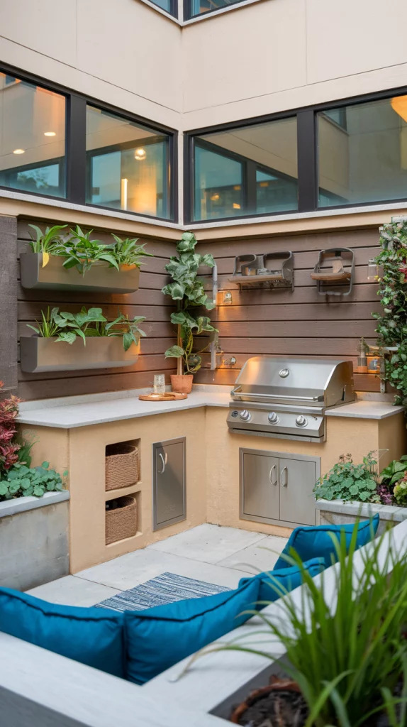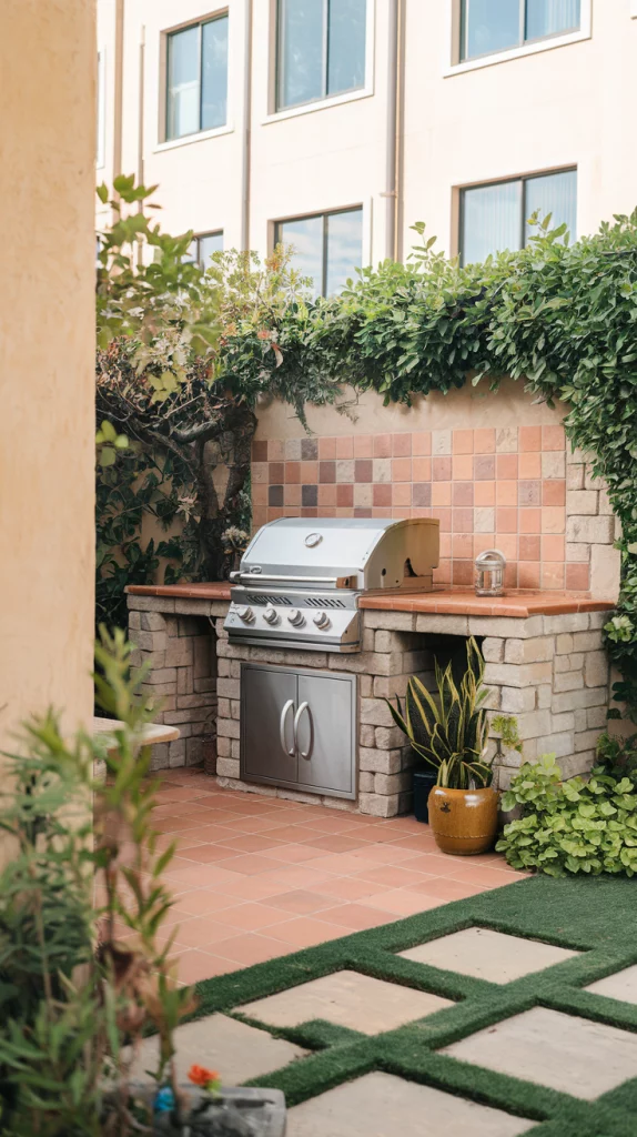 Corner BBQ areas are an excellent way to optimize garden space. Position the grill and prep station against a corner to create an efficient layout that leaves more room for seating or other features. Use L-shaped counters or built-in shelves to maximize functionality. Add vertical planters or wall-mounted storage racks to keep the area tidy and visually appealing.