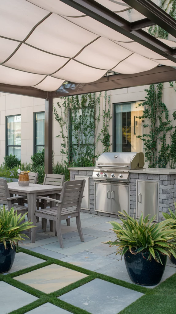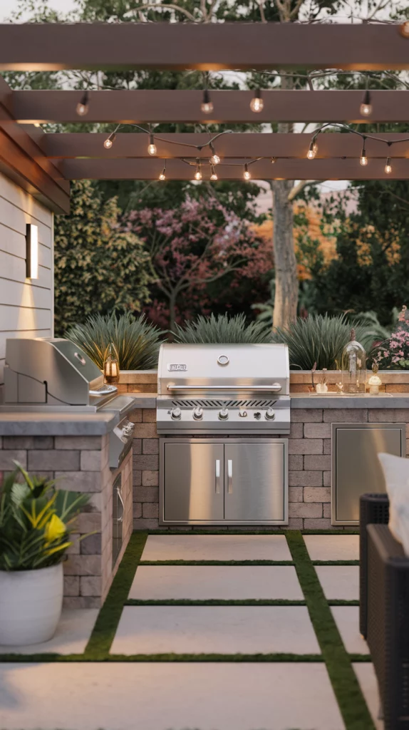 Pergolas add elegance and functionality to your outdoor BBQ area. A pergola provides shade and defines the space while enhancing its aesthetic appeal. Opt for wood or metal structures and decorate with string lights, hanging plants, or flowing fabric drapes. This creates a cozy, modern atmosphere perfect for dining and entertaining.