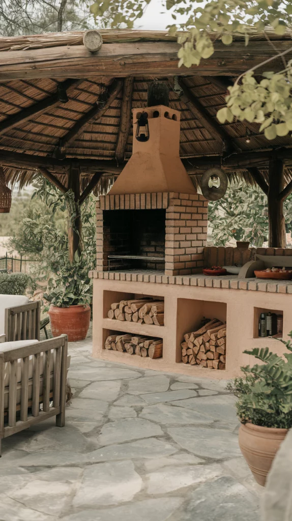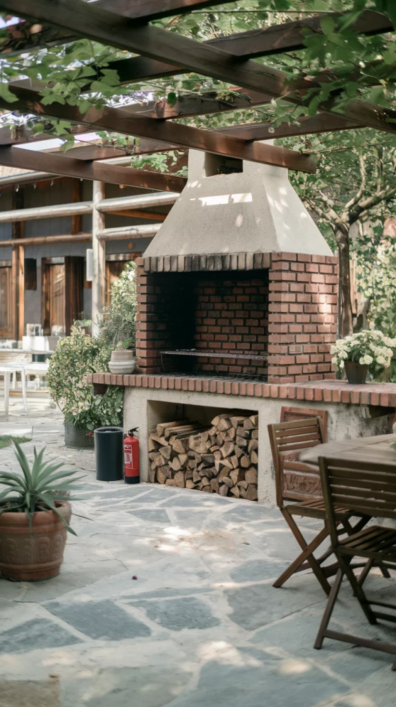 Stone and brick BBQ structures offer durability and rustic charm. Use these materials to build a grill housing or even an entire outdoor kitchen setup. Complement the look with stone flooring and matching furniture. Add decorative elements like a stone backsplash or a built-in wood storage rack to enhance functionality.